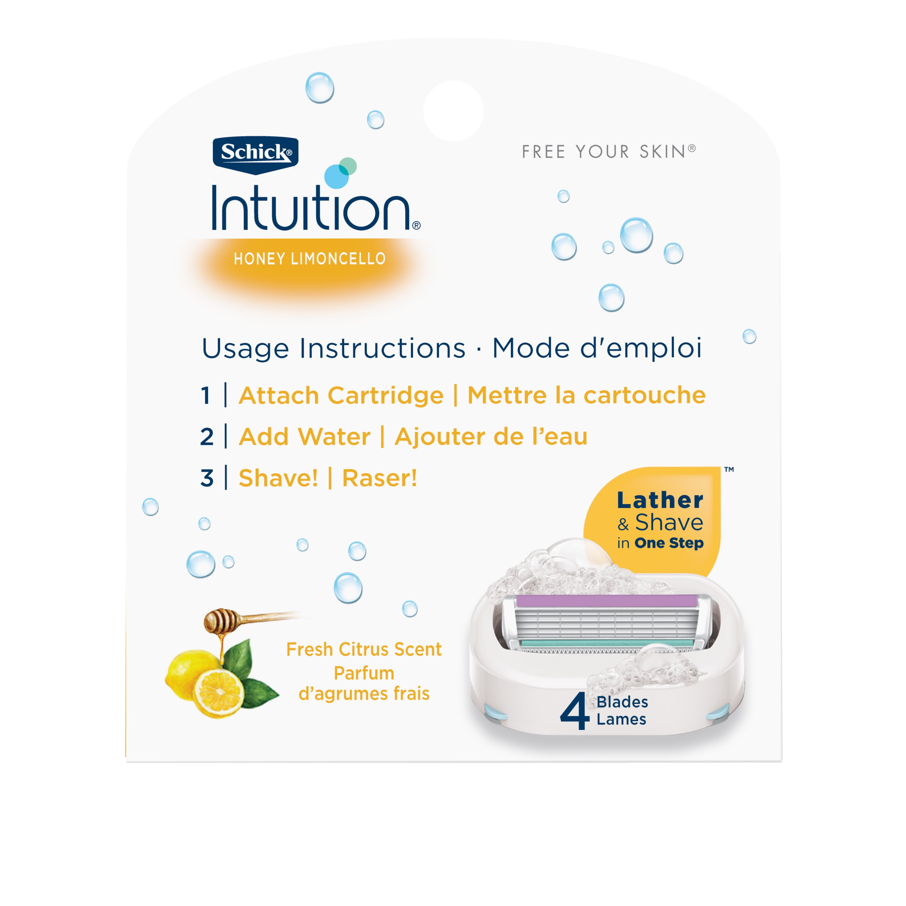 Schick® Intuition® Honey Limoncello puts the shave cream right on the razor! With fragrant notes of bergamot and amber, Schick® Intuition® Honey Limoncello refills are infused with shea butter to help soften and moisturize the skin during shaving. The formula lathers and moisturizes during shaving, so there’s no need to use shave gel. It provides a hassle-free shave, cares for your skin and features a 4-blade pivoting head to glide smoothly along the contours of your legs and body. All Schick® Intuition® Refill Razor Blades can be used with any Schick® Intuition® Razor. Refills are available in 3-count and 6-count packs.