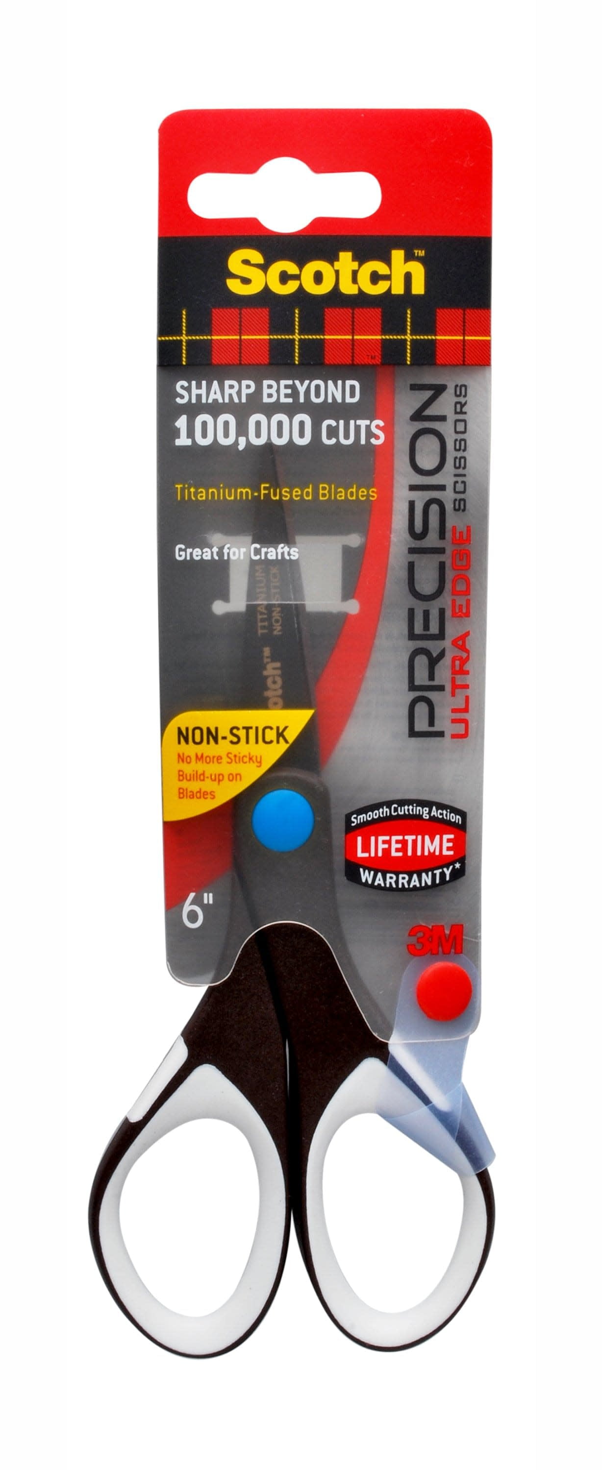Scotch Precision Ultra Edge Non-Stick 6" Scissors come with the high quality titanium-fused blades for a sharp edge beyond 100,000 cuts. Professional quality you expect from Scotch Brand. Non-stick coating on blades resists sticky build up to save you time cleaning blades. Ideal for use with crafts, fabrics, cardstock and photos. Scotch Brand Tip: if needed, use a damp cloth to clean adhesives from blades. Soft comfort grip handle design is ideal for left or right-handed use to help keep creativity going. Keep them handy for everyday cutting needs. Stay rest assured with our limited lifetime warranty. Contains 1, Scotch Precision Ultra Edge Non-Stick 6" Scissor.