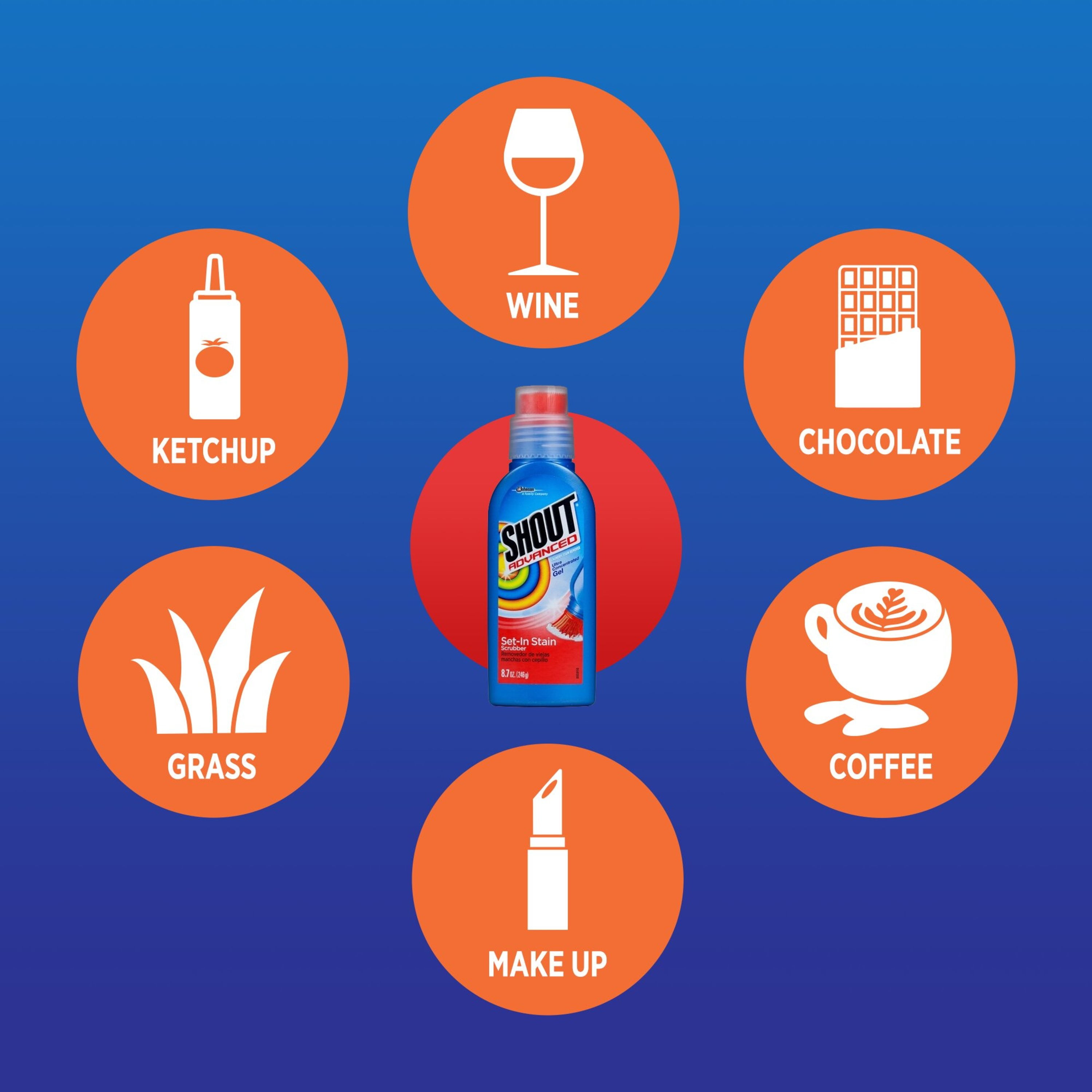 Shout Advanced Ultra Concentrated Gel Brush Laundry Stain Remover is tough on stains, but gentle on your color-fast machine-washable fabrics. This thick gel formula concentrates stain-lifting power directly onto the stain, and built-in brush makes tackling tough stains easy. The Set-In Stain Scrubber works the enzymes deep into the fabric fibers to treat a variety of stains including dried food stains, coffee, wine, and makeup. Safe for all colorfast washables and works in all water temperatures. Shout has the stain-fighting ingredients to break up and remove tough stains so you can live in the moment, and clean up later.