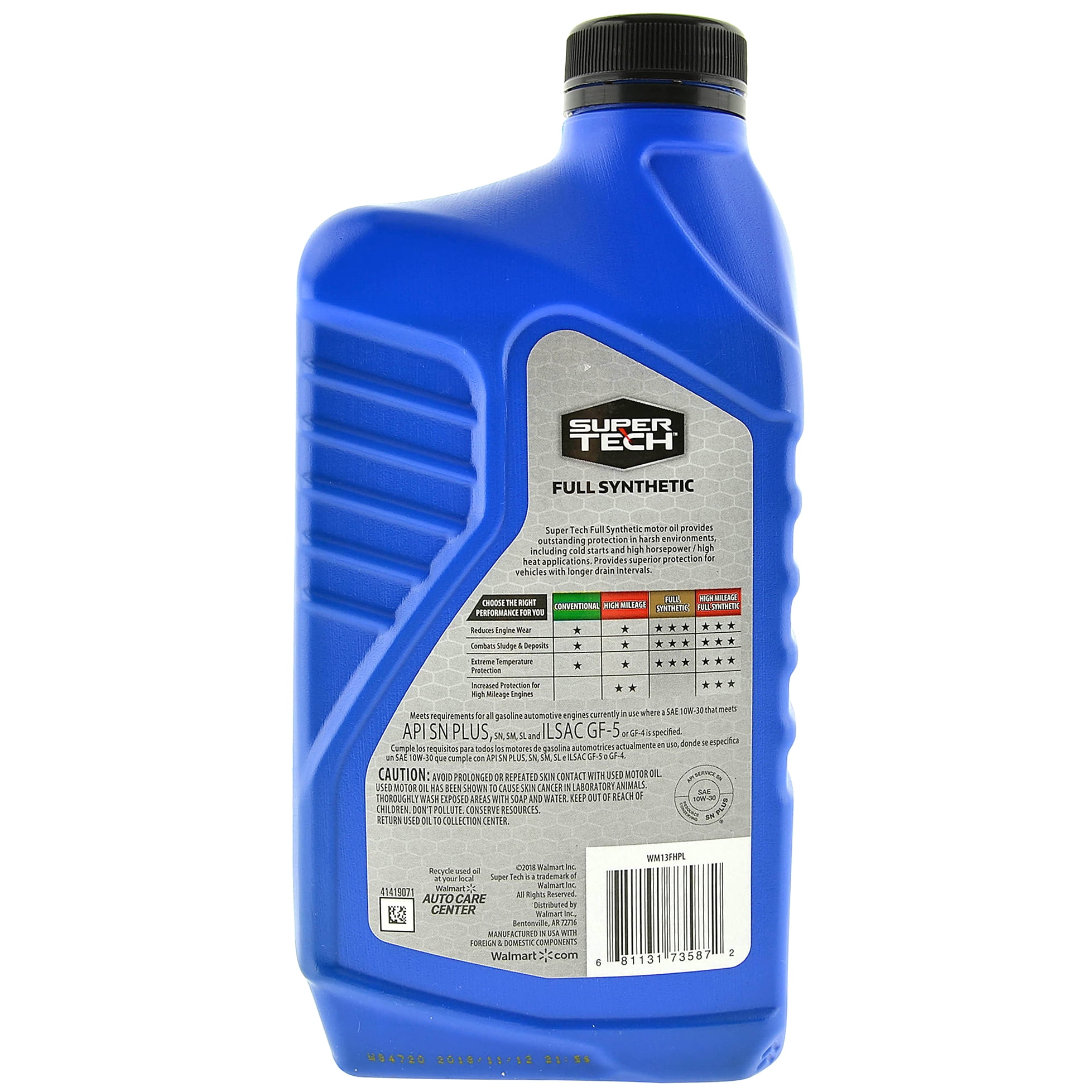 Super Tech Full Synthetic 10W-30 Motor Oil offers 10,000 mile superior wear protection to keep your vehicle performing well. Super Tech Full Synthetic 10W-30 motor oil comes in a convenient quart bottle. This Super Tech Full Synthetic 10W-30 motor oil is made with a combination of premium base oils and an enhanced additive system to provide increased protection for your engine. It features a high-performance formulation for gasoline engines so that yours can function smoothly and efficiently. This Super Tech motor oil provides 10,000 mile superior wear protection and outstanding resistance to thermal breakdown at operating temperatures. It also helps to reduce harmful deposits and acids that can damage your engine and other components and rob them of their power. Super Tech Full Synthetic Motor Oil is compatible with conventional engine oils. Meets requirements for all gasoline automotive engines currently in use where a SAE 10W-30 that meets API Specifications SP and ILSAC GF-6A or previous standards are specified. Always check manufacturers’ recommendations for proper SAE grade and API classification. Also available in a 5 quart jug. Pour it in and help your vehicle continue to perform at a high level.