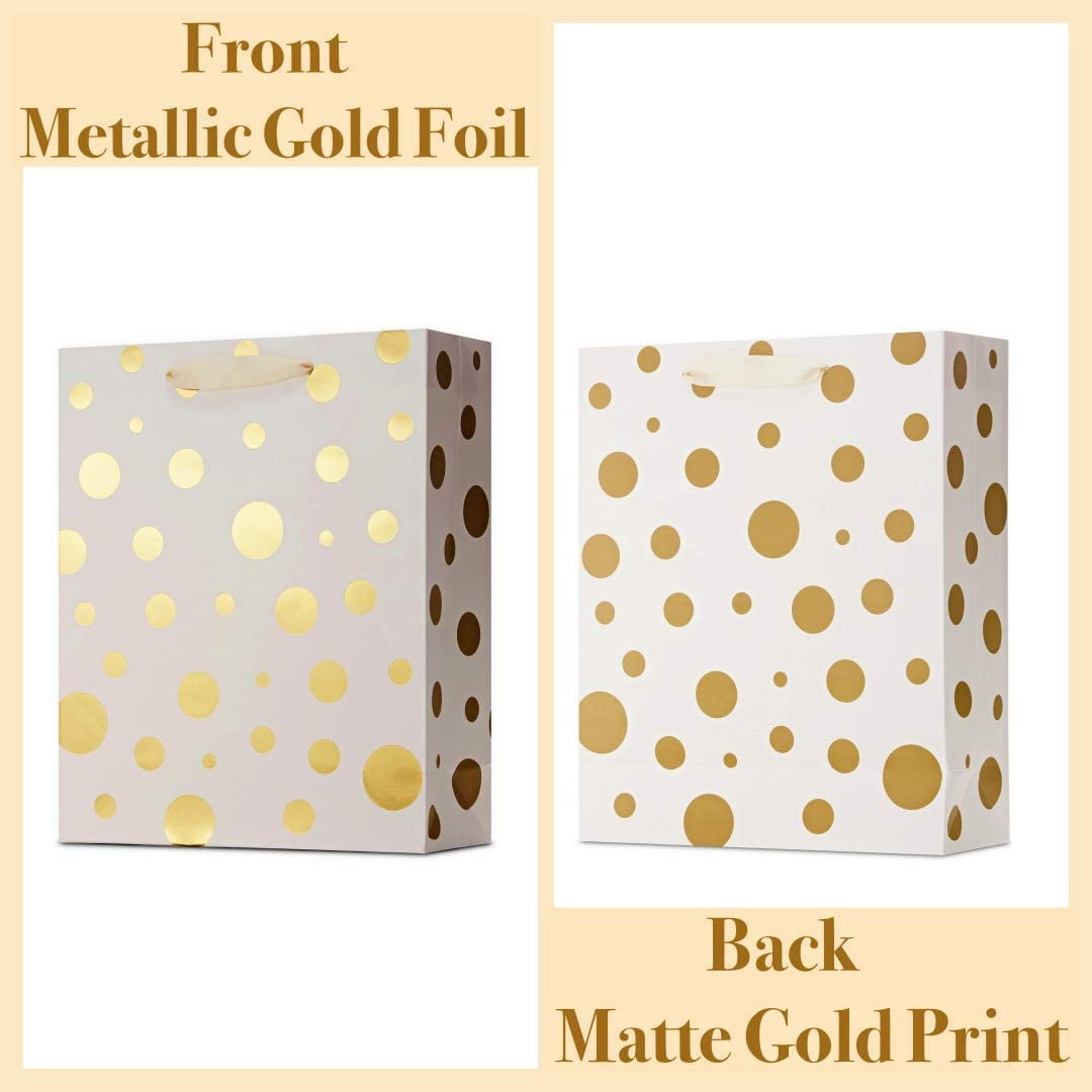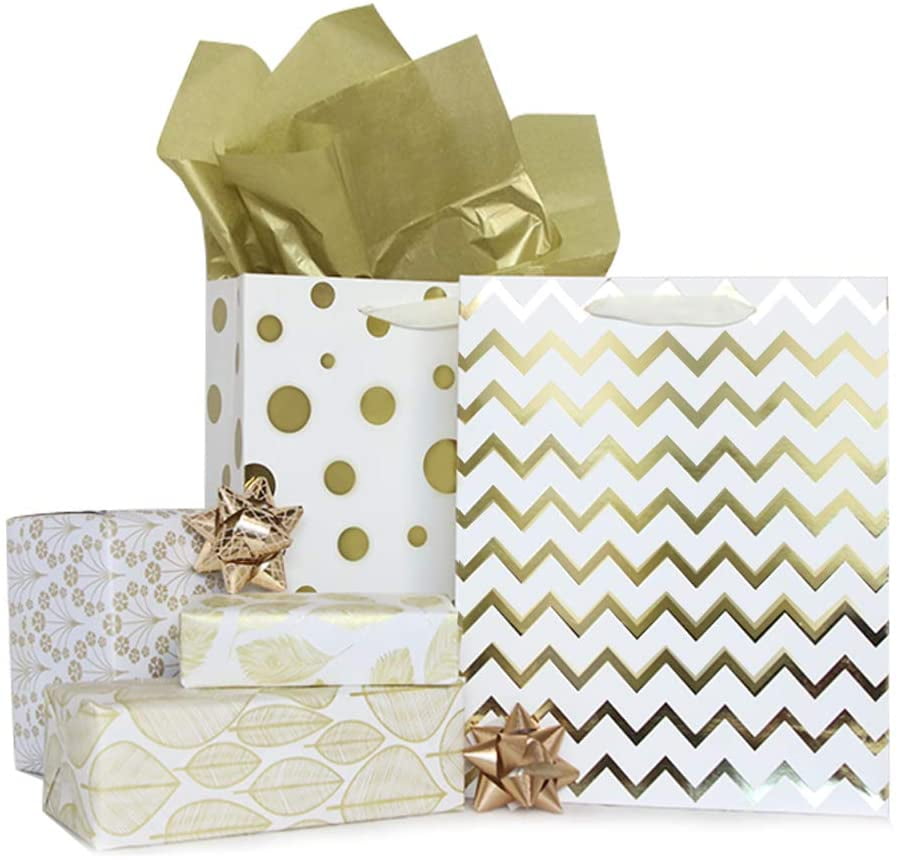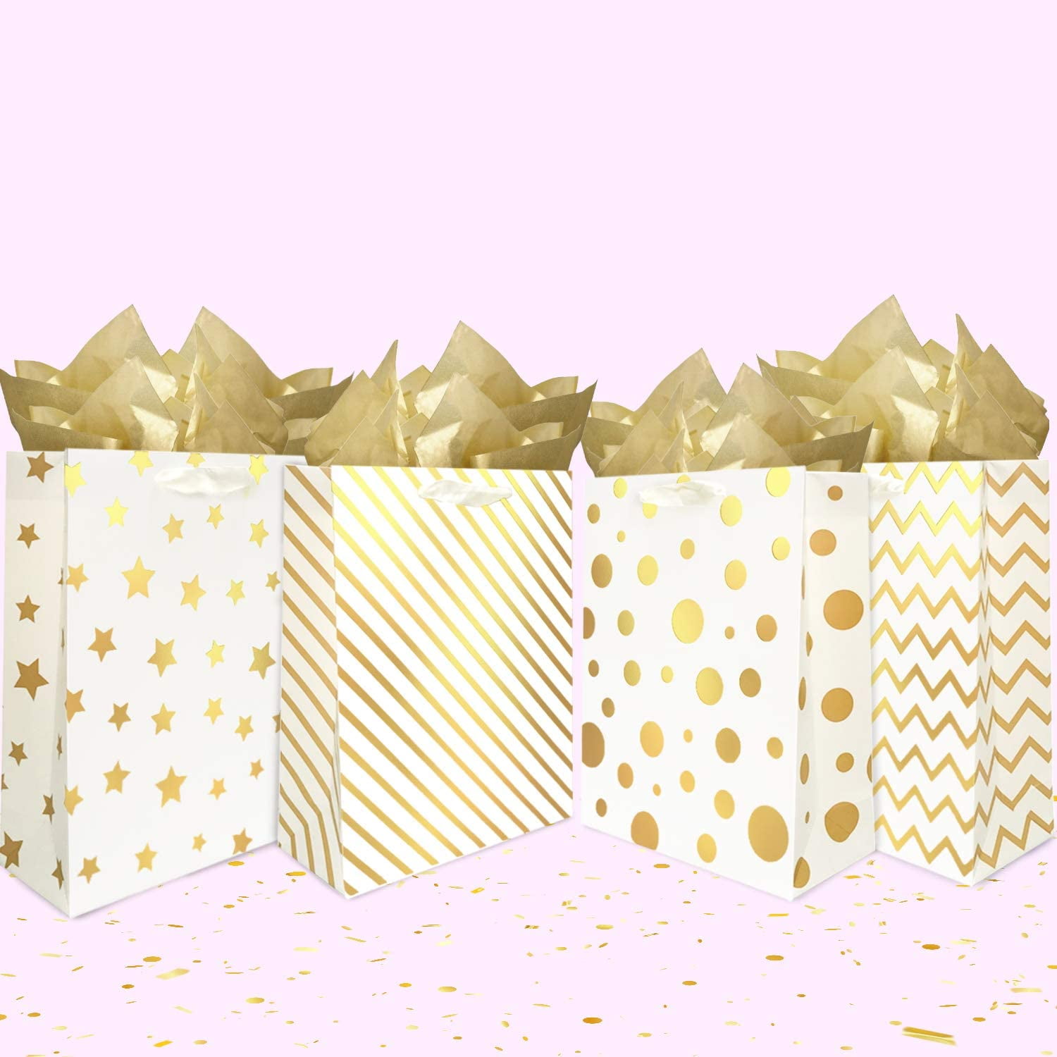 12Pcs Gold Metallic Foil Gift Bags Bulk with 12 Sheets Gold Tissue Paper and Ribbon Handles, Large 12.6 Inch 4 Assorted DesignUNIQOOO Gold Metallic Foil Gift Bags Bulk with Gold Tissue Paper, 12 Set