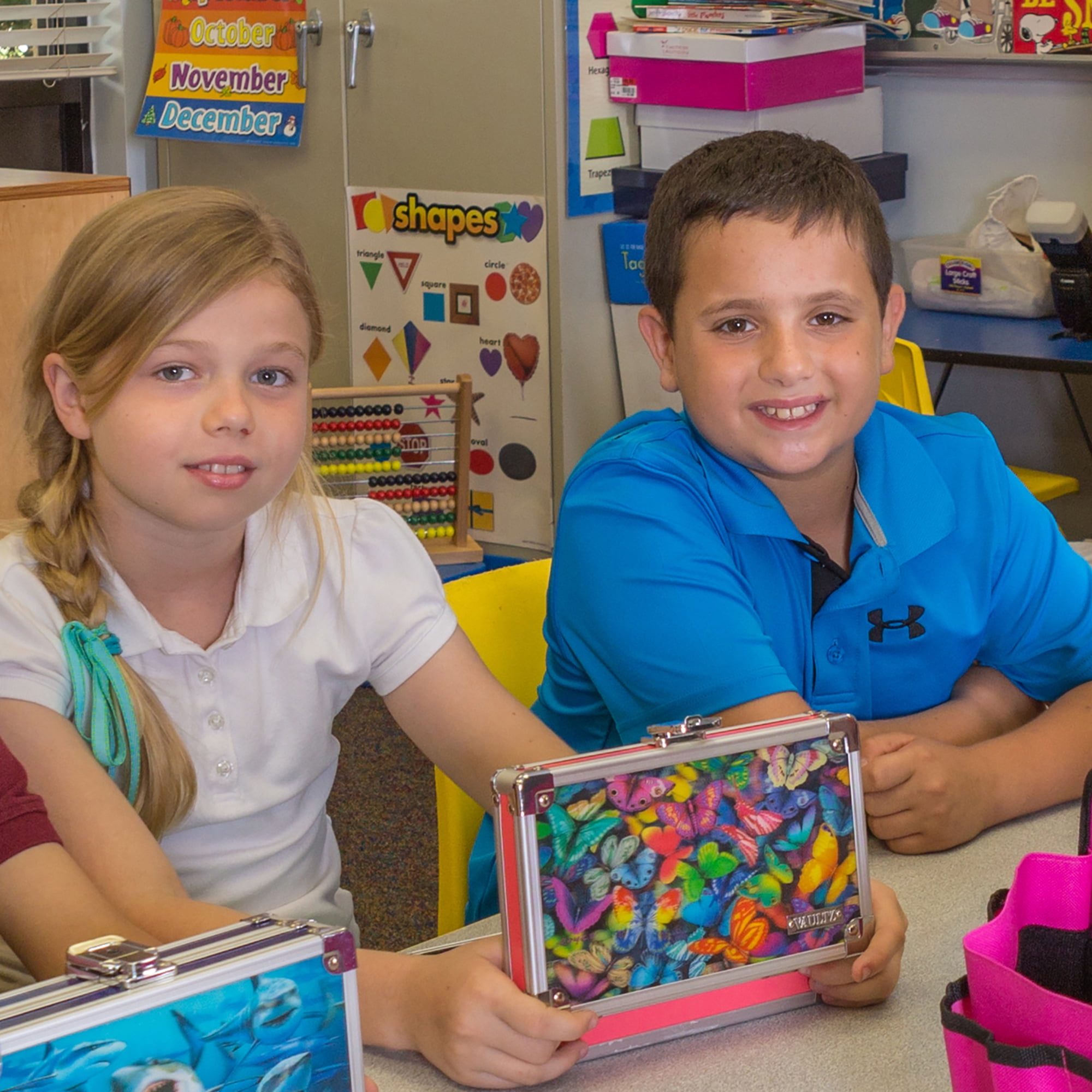 This Vaultz Locking Pencil Box in our 3D Butterfly design is the perfect size to throw in a backpack, desk, drawer, or glove compartment. This item features a mesh pocket and elastic pencil band inside the case to keep your items secure and organized. This pencil box comes with two keys and a reliable key lock. The dimensions are 5.5” (height) x 8.25” (width) x 2.5” (depth).