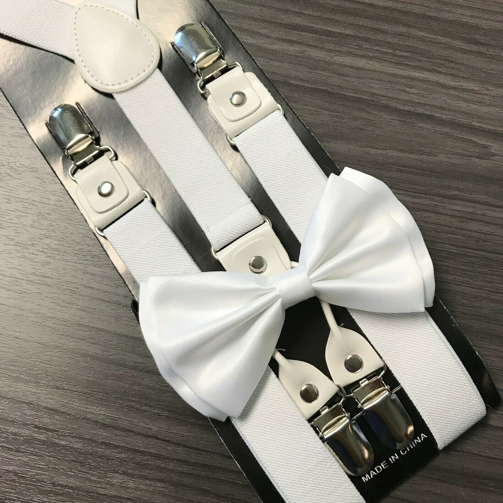 White 4 Clip Suspender + Clip on Bow-Tie Matching Set for Adults Men Women