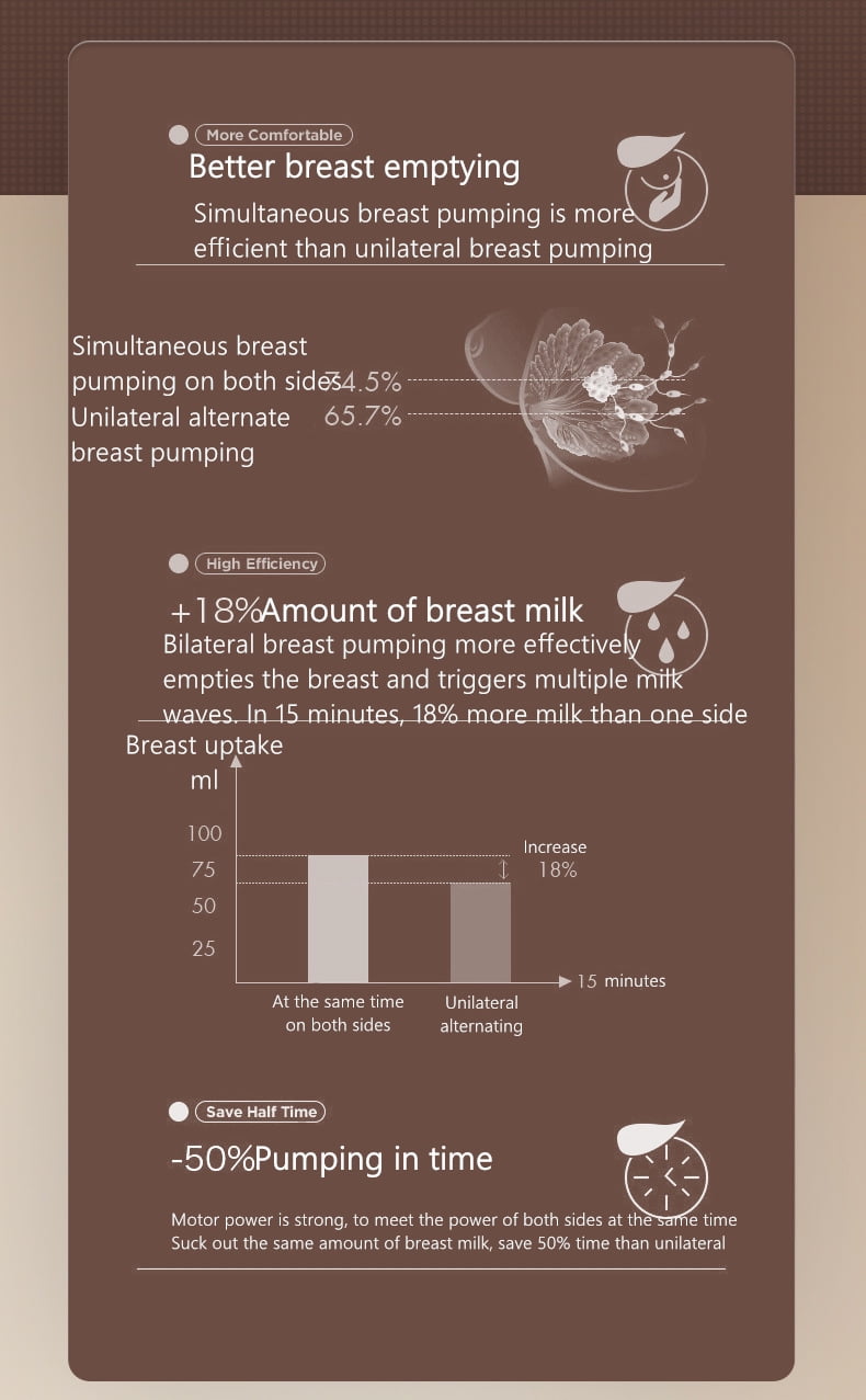 Efficient and painless: the double breast pump design can suck more effectively and provide more breast milk (80-300mmhg) in a shorter time. It can save up to 80% of the time compared with the ordinary breast pump, which is really important for novice mothers. The soft massage silicone pad will imitate the baby’s sucking rhythm and provide a soft and warm feeling