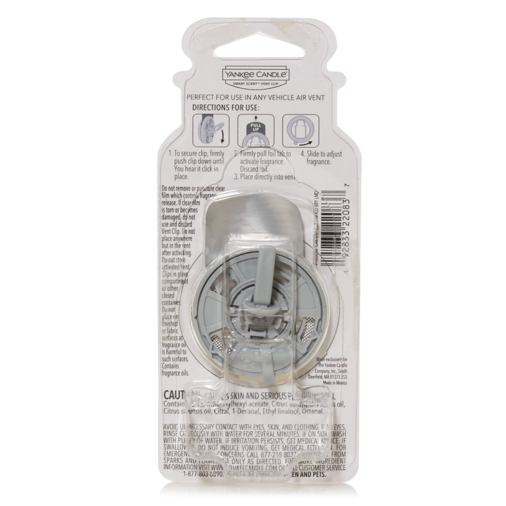 Never run out of your favorite Yankee Candle fragrance when you’re on the road. Smart Scent Vent Clips have a clear window so you can easily see when you need to replace them. The air freshener fastens to your dash vents and releases fragrance with the airflow. The slider on the back lets you adjust the level of scent.Iced Berry Lemonade -A refreshing fusion of strawberry, lemon, and tart grapefruit aromas chilled and made for enjoying on the patio. Smart Scent Vent Clips work best with temperatures of 70 degrees (F) or above flowing from the vent. Clips easily onto car vents; also great in other small spaces like lockers or closets. Up to 30 days fragrance life