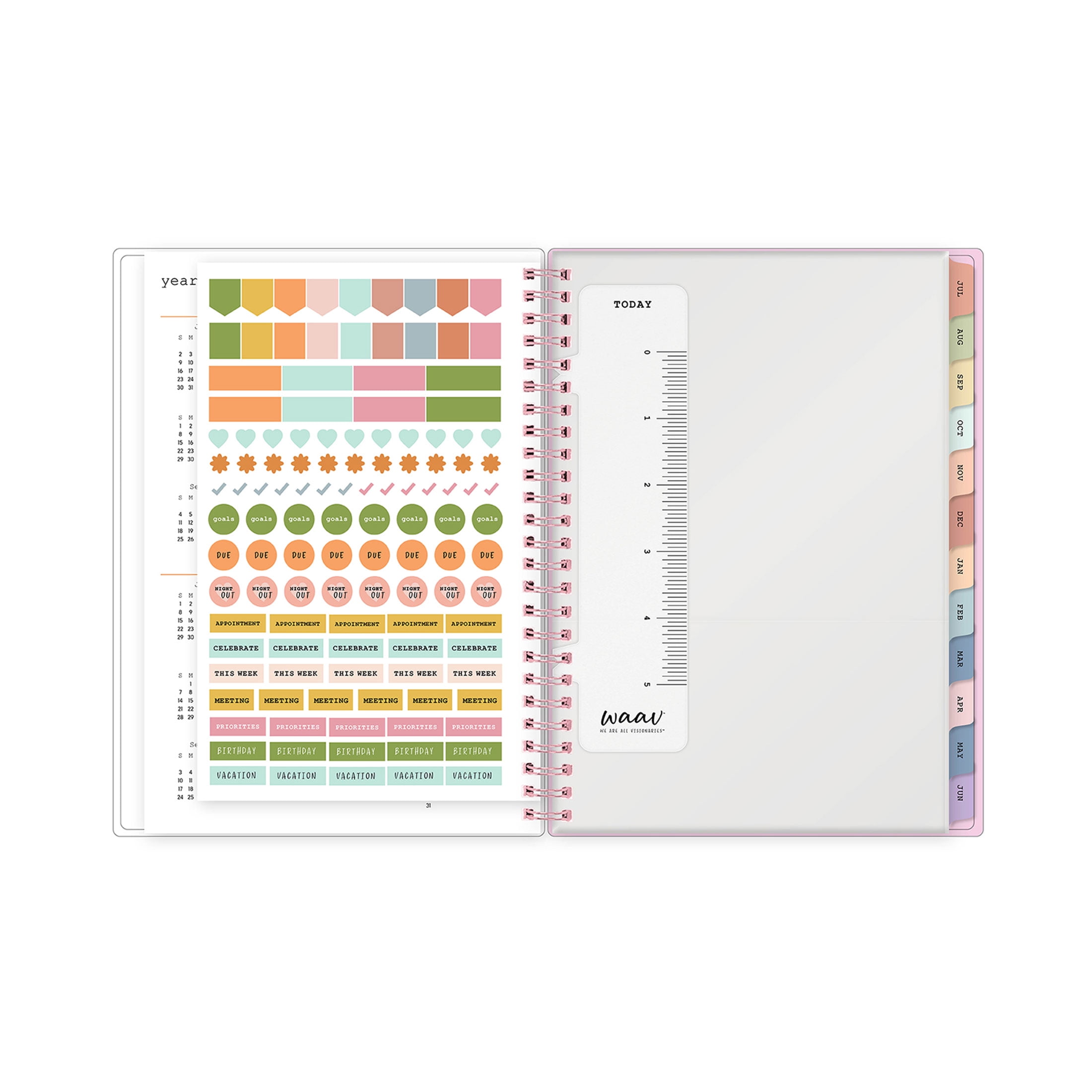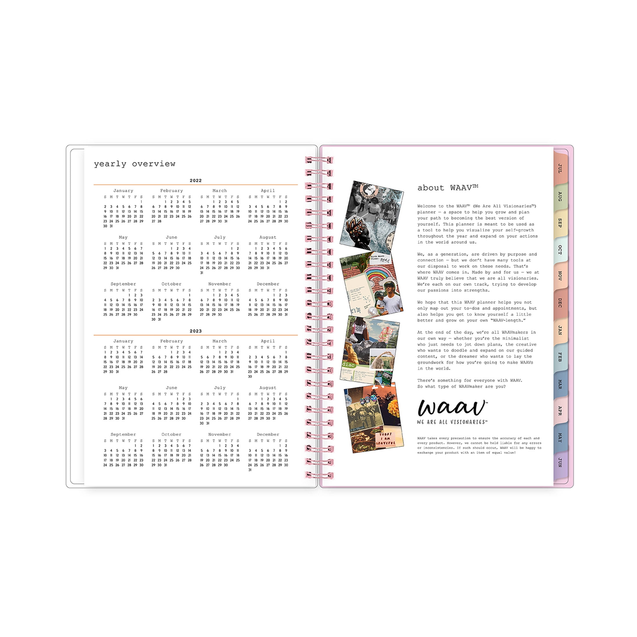 Looking for a planner with more writing space? The WAAV planner notes is for you! In addition to traditional weekly/monthly layouts, this academic planner has 21 lined pages for notes. Every aspect of the planner notes was thoughtfully constructed, from providing a platform for up-and-coming Gen Z artists to share their art, to sourcing the best eco-friendly materials. Monthly content and coordinating themes provide inclusion, education, and recognition within the diverse community of WAAV makers around the world. WAAV (We Are All Visionaries) believes in conscious planning, so each planner notes includes a storage pocket, stickers, and a snap-in bookmark, as well as designated areas for self-care, goals, and quotes that inspire or empower you throughout the school year. Flexible cover features the retro Zarha tile pattern, and the super thick, recycled paper provides less bleed-through when you use saturated pens and markers. Dated July 2022 to June 2023.
