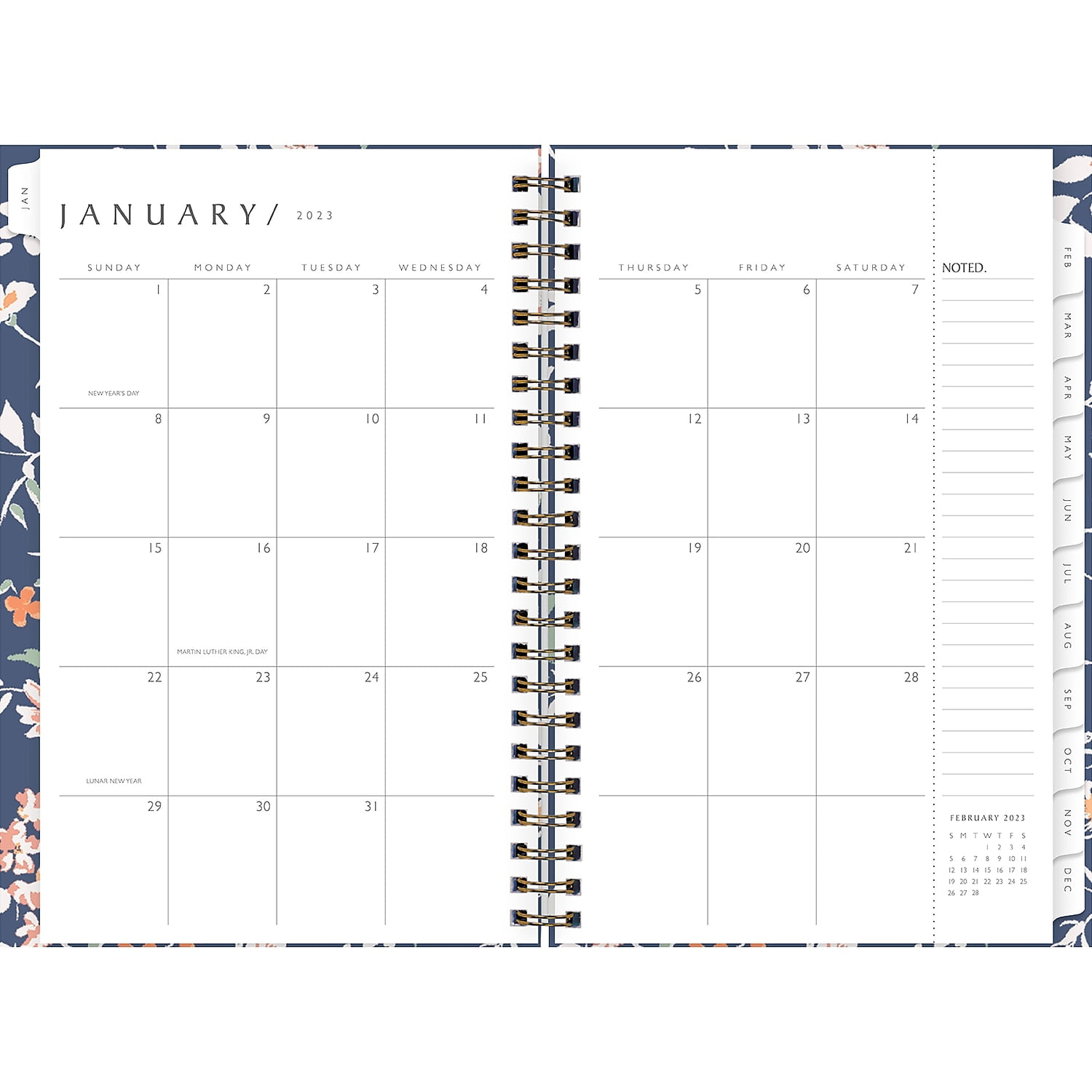- Weekly and monthly pages cover a 12-month range from January 2023 to December 2023. Includes a storage pocket and extra notes pages.