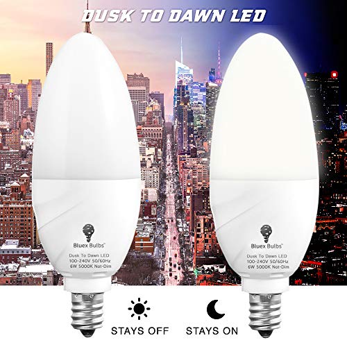 4 Pack BlueX Dusk to Dawn LED Bulbs, 6W E12 Base Light Bulb – 65W Equivalent – 5000K Daylight White – Smart Light Sensor Candelabra Bulb, Home Security Indoor, Outdoor, Driveway, Yard, Porch Lighting