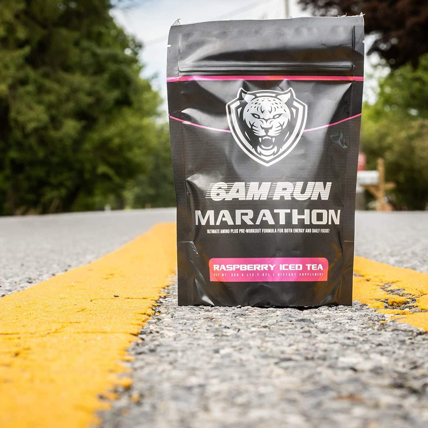 What if we told you that in ONE supplement you get Hydration, BCAA’s, Energy, Vitamins, and more? 6AM Run Marathon provides these benefits in a delicious Peach Mango or Raspberry Iced Tea flavor!This pre workout supplement provides premium amino energy for running, post run recovery, and lean muscle building. Get 10+ hours of pre run energy and post run recovery with this all in one hydrant drink. Take it pre, post, or even during your marathon run.Live studies show that Branch Chain Amino Acid Powder can improve breathing (BCAA supplementation decreased blood CO2 levels by 9%, which normally increases with exercise). Build and maintain lean muscle with the best amino energy formula containing BCAAs and essential amino acids.Marathon is vegan and keto friendly! We designed our cardio supplements so that anyone can experience marathon energy.Start YOUR 6AM run with MARATHON Energy.