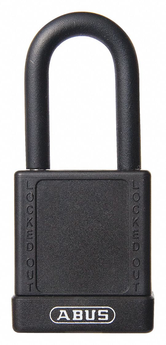 Lockout Padlock, Key Type Alike, Body Material Aluminum, Shackle Dia. 1/4 in, Shackle Height 1 1/2 in, Shackle Material Plastic Encased Steel, Shackle Width 3/4 in, Body Width 1 1/2 in, Body Thickness 51/64 in, Legend Danger Locked Out, Includes English, Spanish, French Lockout Labels, Standards OSHA, Body Height 1 3/4 in, Body Color Black, Shackle Type Open, Bumper Color Black