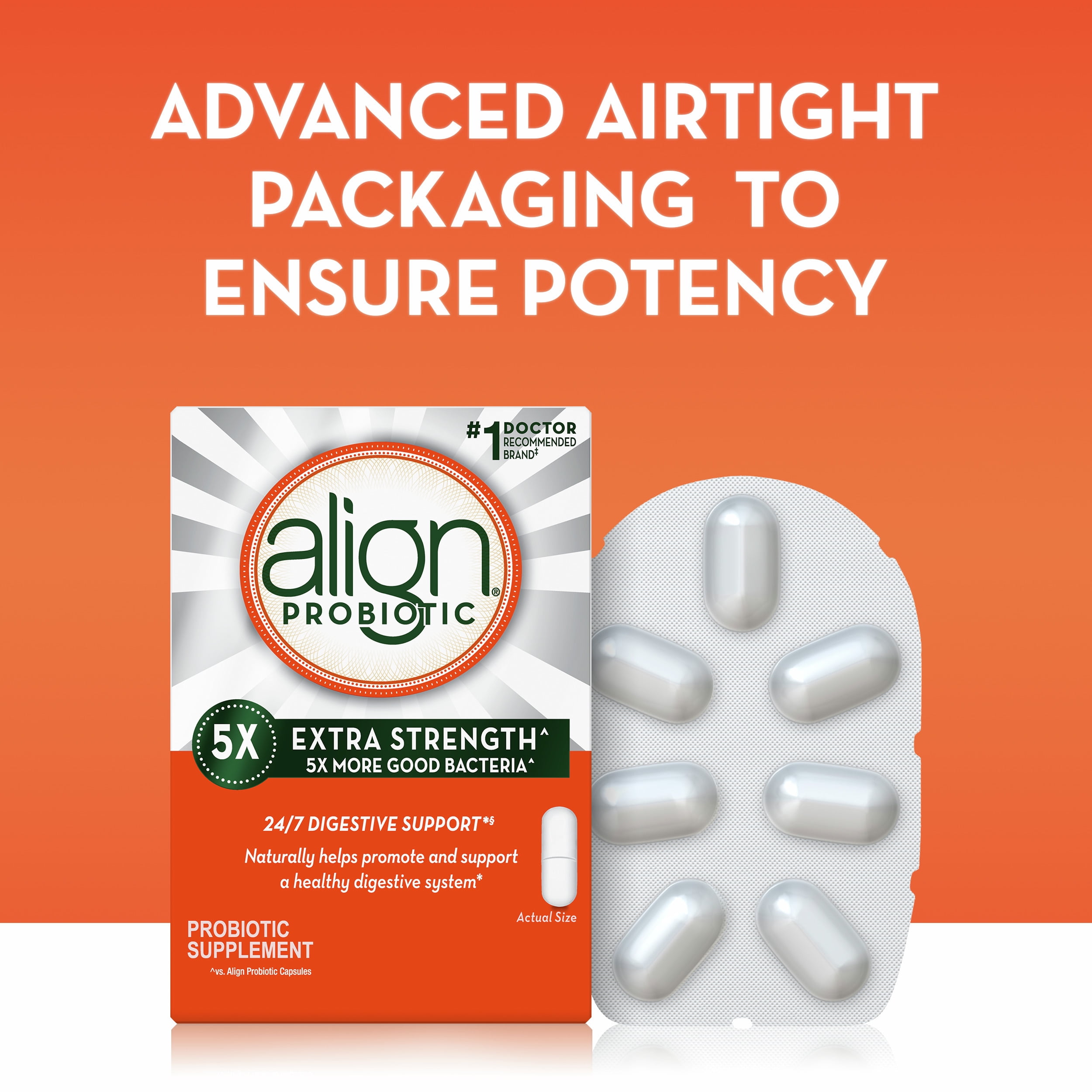 THE PROBIOTIC BRAND DOCTORS RECOMMEND MOST. Recommended by Gastroenterologists two times more than any other probiotic, Align daily probiotic supplement is the #1 doctor and gastroenterologist recommended probiotic brand. Align Extra Strength^ is a daily probiotic supplement that fortifies your gut with 5X the good bacteria^ to help you maintain digestive balance.* Discovered by Gastroenterologists and backed by 20+ years of research, Align Extra Strength Probiotic contains the unique strain Bifidobacterium 35624 and naturally helps soothe occasional abdominal discomfort, gas, and bloating*. Taking one capsule a day helps to maintain your digestive system’s natural balance. Align Extra Strength Probiotic is vegetarian, gluten-free, and soy free and no refrigeration is required. *THESE STATEMENTS HAVE NOT BEEN EVALUATED BY THE FOOD AND DRUG ADMINISTRATION. THIS PRODUCT IS NOT INTENDED TO DIAGNOSE, TREAT, CURE, OR PREVENT ANY DISEASEAmong Doctors and Gastroenterologists who recommended a brand of probiotic in ProVoice 2021 survey^vs. Align Probiotic Capsules