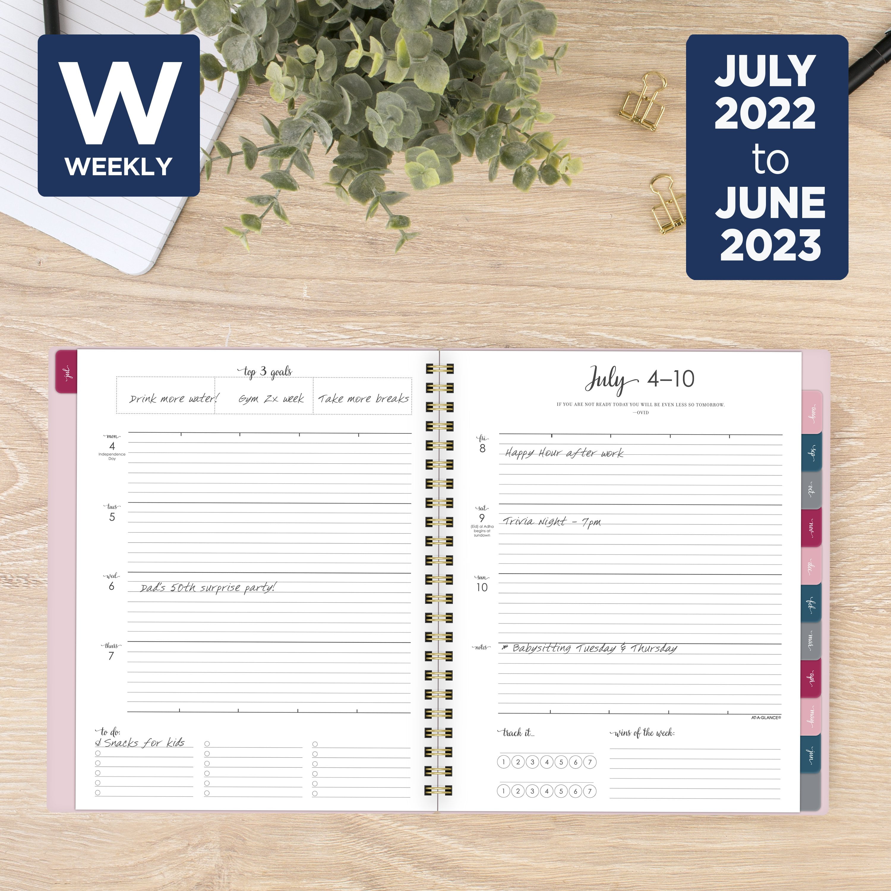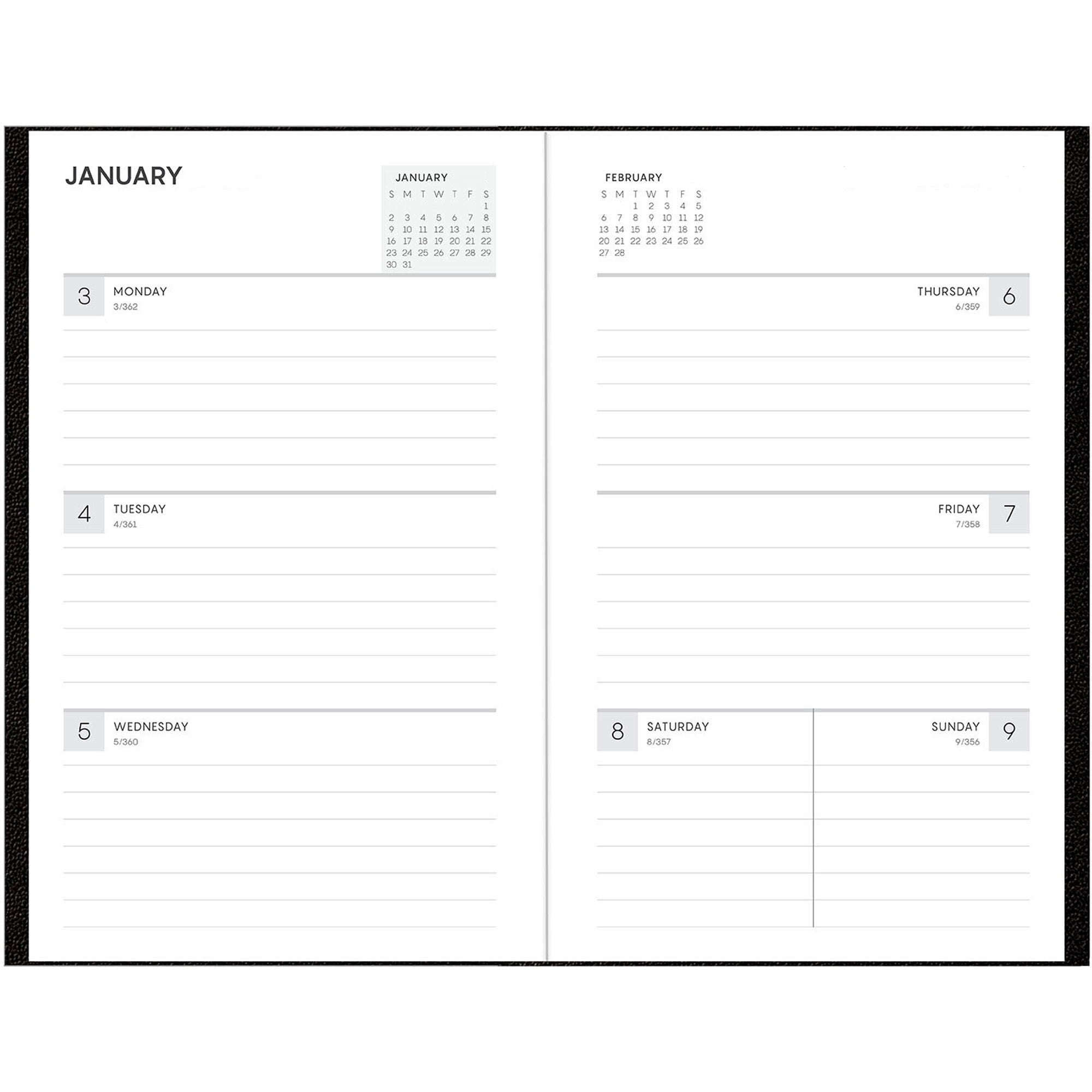 "Unburden your life and accomplish more when you use a 2021 Aligned weekly/monthly planner, featuring a stapled spine for a slender, packable format. Clean layouts and uncluttered pages offer mindful space for organizing your life. Perfect for professionals, students or those starting a new chapter in life, the Aligned weekly planner is a must-have for the person on the go. Additional features include a yearly overview, reference calendars and dot grid pages for lists and freeform writing. Calendars are dated January 2021 – December 2021 and include bonus months, so you can get a head start on the new year. For 12 months of durability and strength, this tastefully monochromatic Aligned planner is crafted with water-resistant vinyl covers, suitable for any office environment or planning style. "