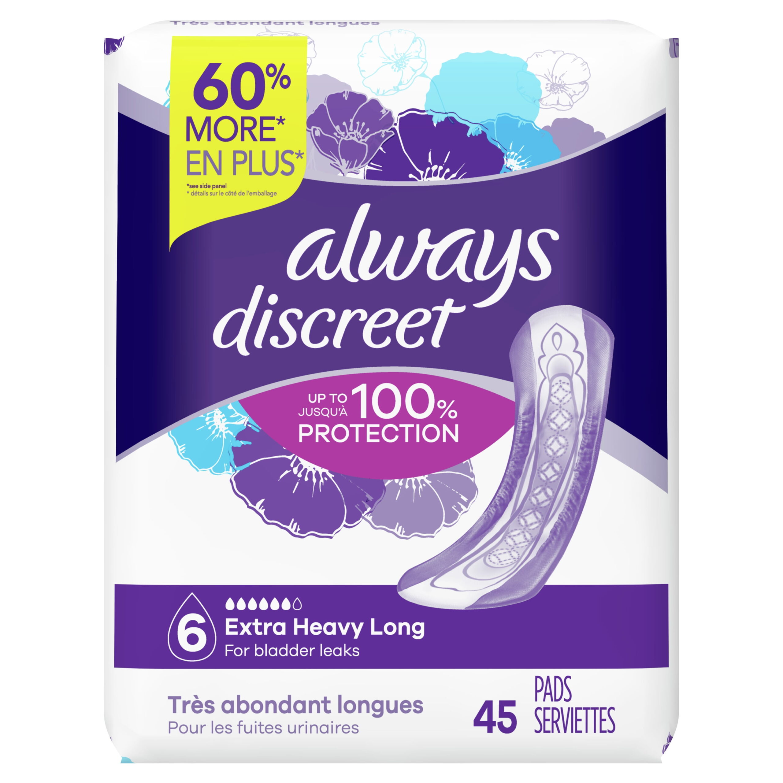 Always Discreet Incontinence Pads, Extra Heavy Absorbency, Long, 45 Ct