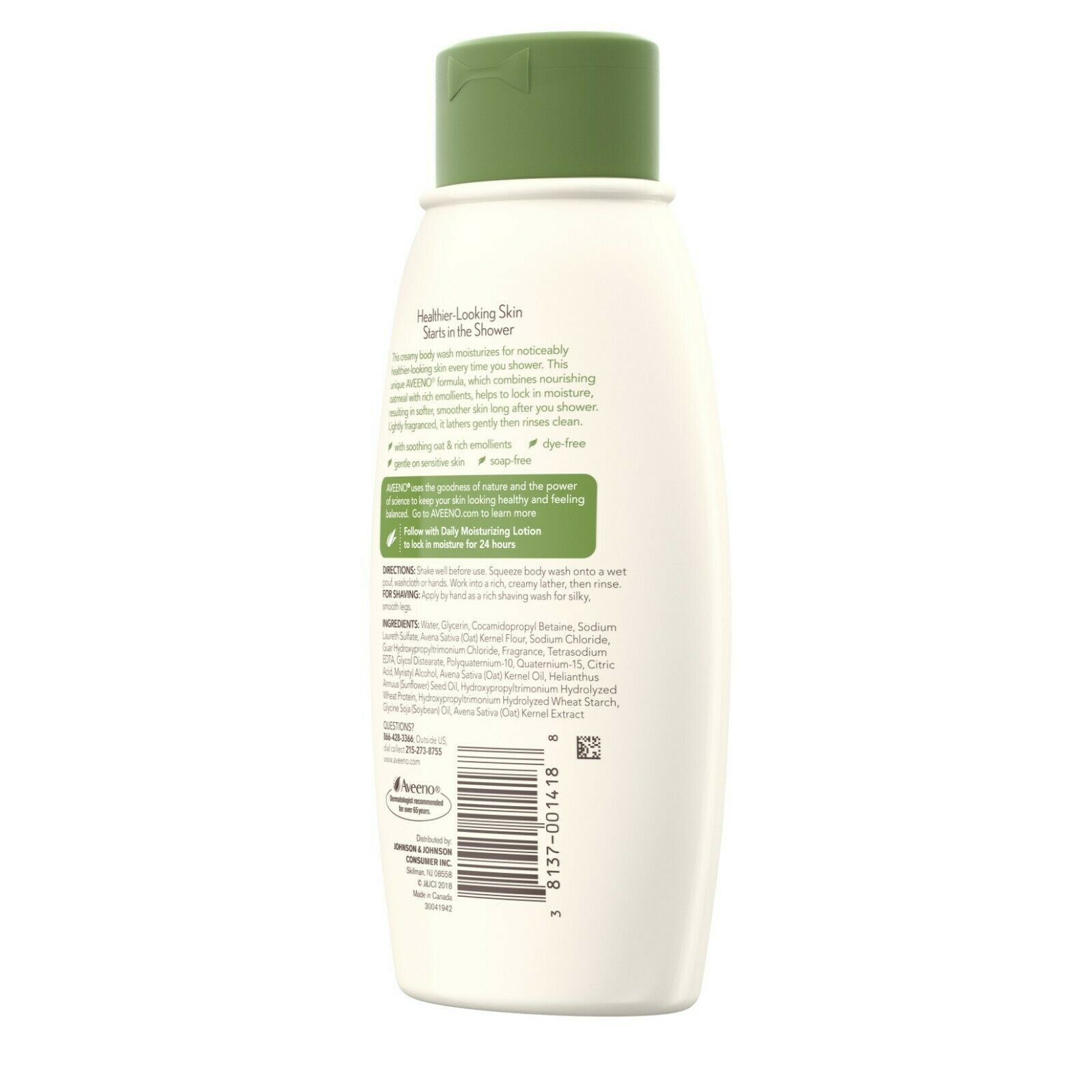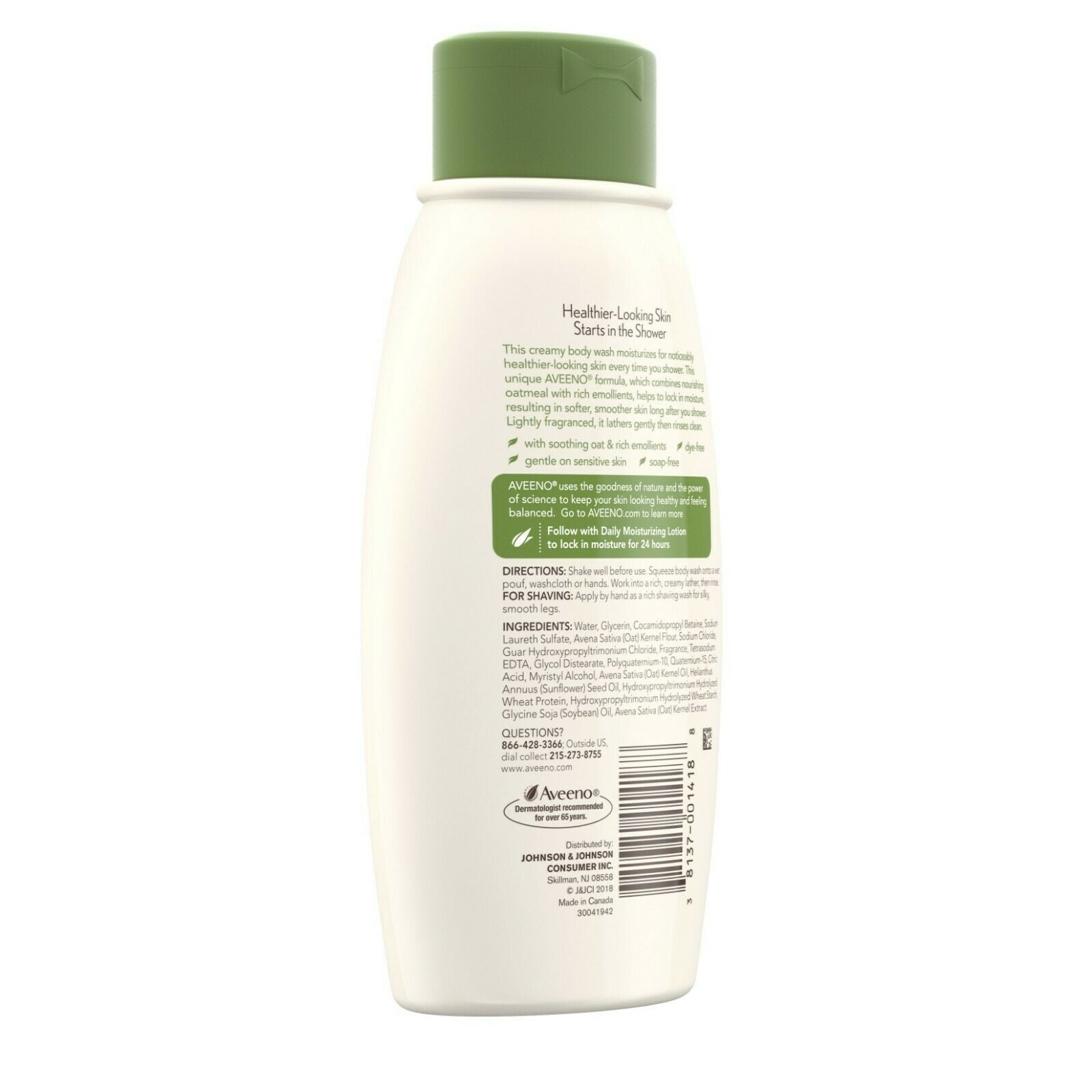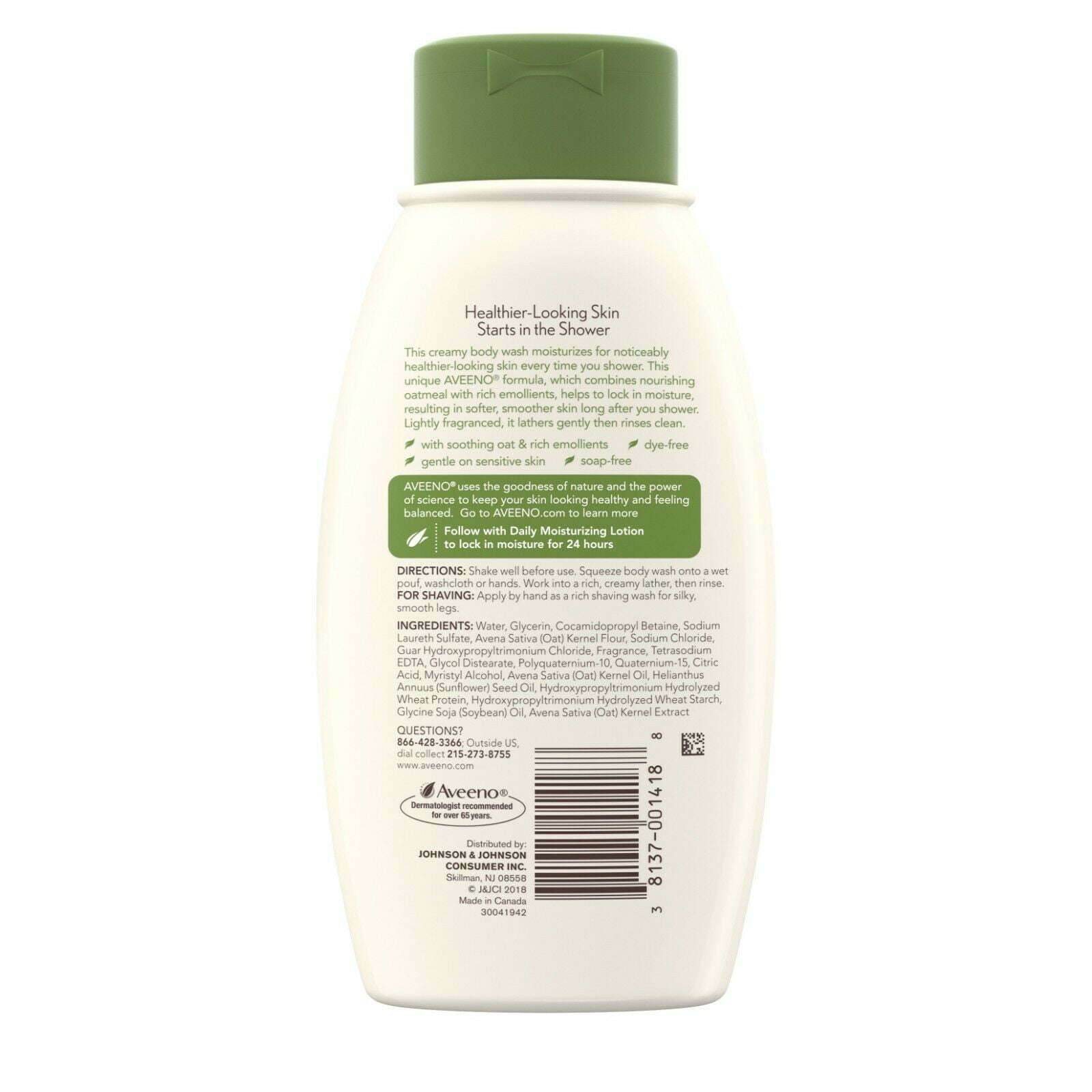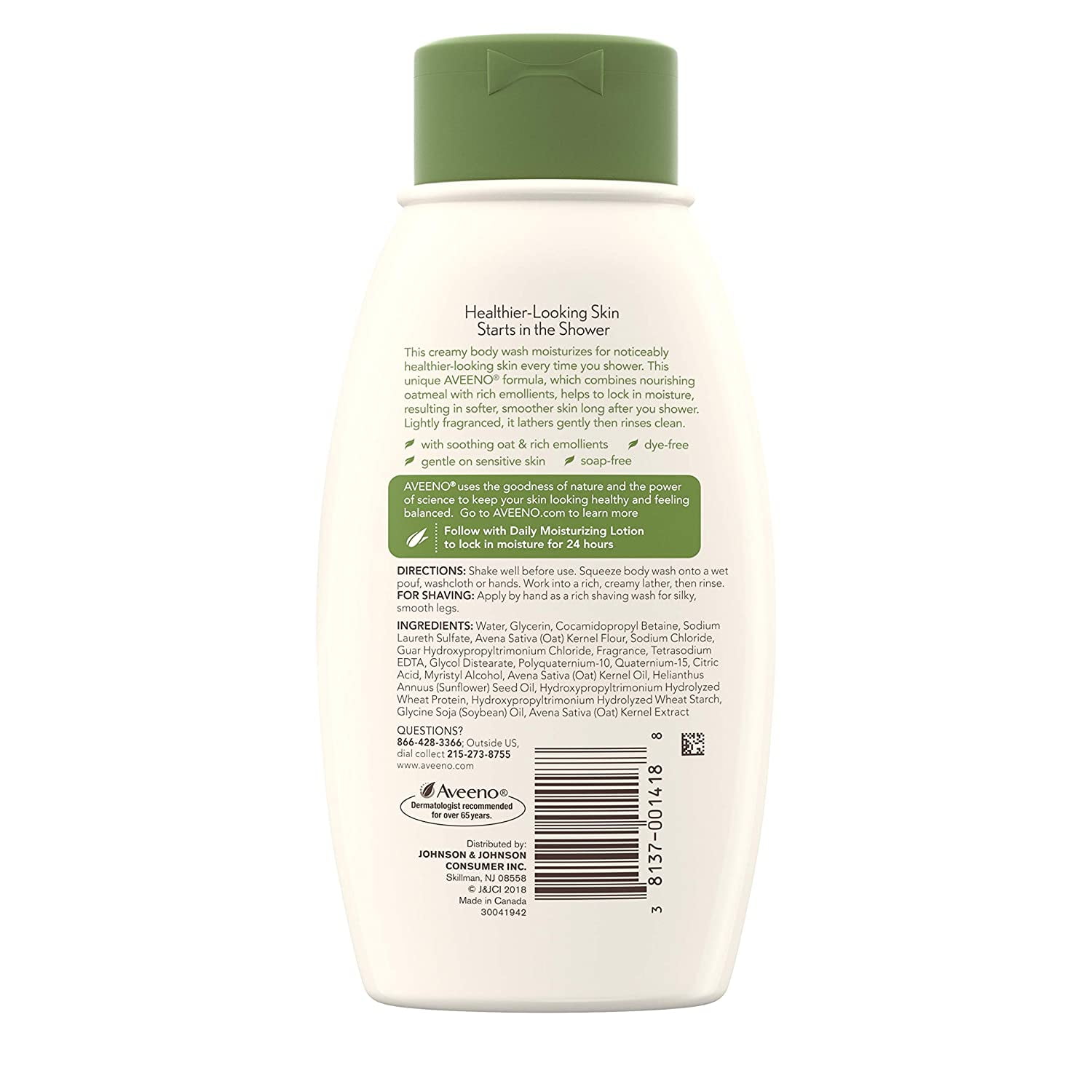 N/AThe AVEENO brand has been dermatologist recommended for nearly sixty years. Active Ingredients: Water; Glycerin; Cocamidopropyl Betaine; Sodium Laureth Sulfate; Avena Sativa (Oat) Kernel Flour; Avena Sativa (Oat) Kernel Extract; Avena Sativa (Oat) Kernel Oil; Glycine Soja (Soybean) Oil; Hydroxypropyltrimonium Hydrolyzed Wheat Protein; Hydroxypropyltrimonium Hydrolyzed Wheat Starch; Helianthus Annuus (Sunflower) Seed Oil; Guar Hydroxypropyltrimonium Chloride; Tetrasodium EDTA; Glycol Distearate; Polyquaternium-10; Quaternium-15; Myristyl Alcohol; Fragrance; May Also Contain Citric Acid Uses: This creamy body wash cleanses and moisturizes for visibly healthier skin every time you shower. This breakthrough formula combines natural colloidal oatmeal – long known to soothe skin – with unique rich emollients to lock in moisture. The creamy, lightly fragranced formula lathers gently then rinses clean, resulting in softer, smoother, healthier-looking skin long after you shower. And it’s soap-free, dye-free and even gentle enough for sensitive skin.