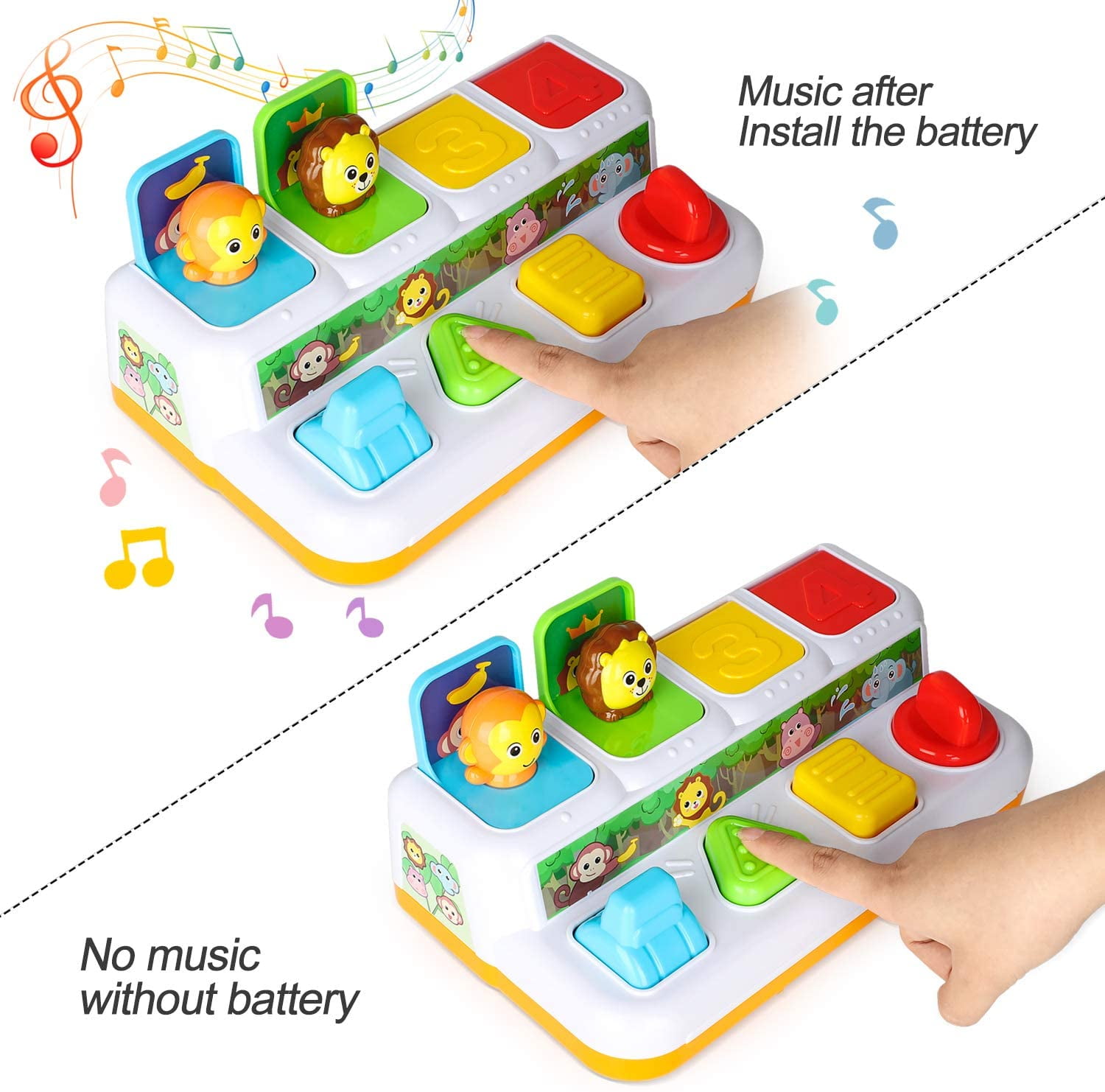 - There is several different music when the animal pop-up and close after install 2 AA batteries(Not include), the volume can be adjust. The animal can pop-up even without batteries just no music.