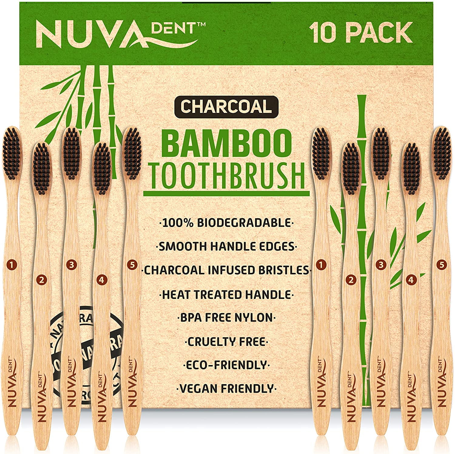 Bamboo Toothbrushes, Charcoal Toothbrushes, Biodegradable, Soft Bristle Toothbrush – Natural Wood Toothbrushes Bulk (10 Pack)