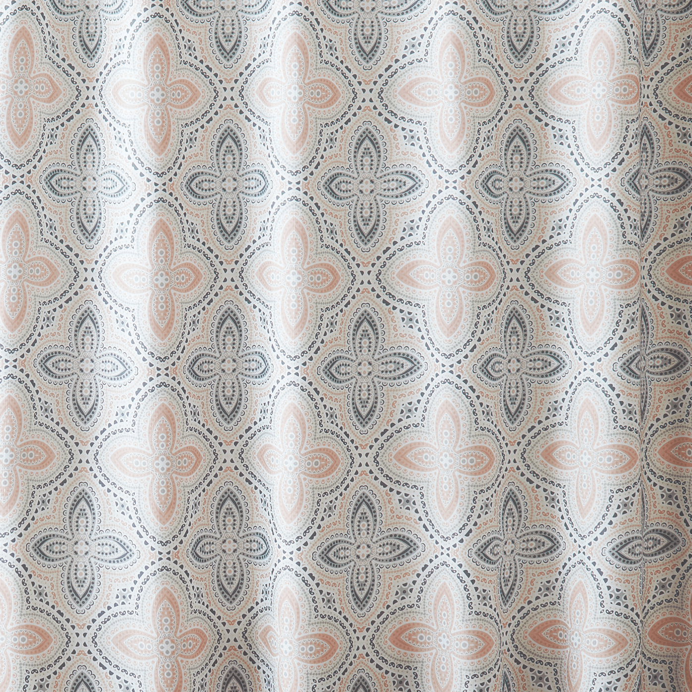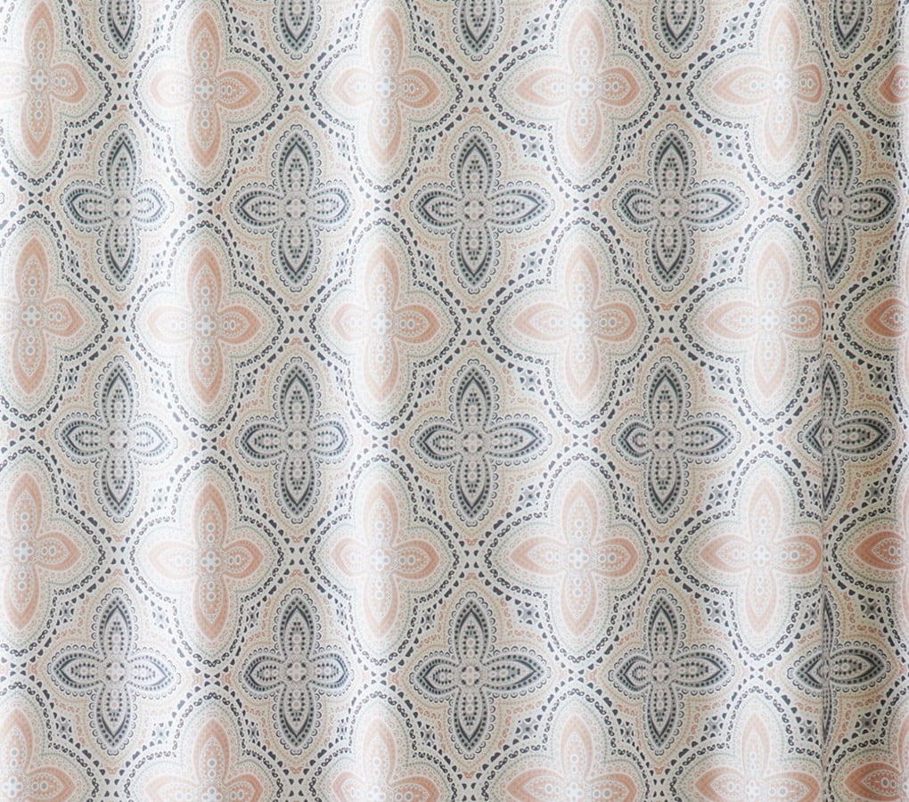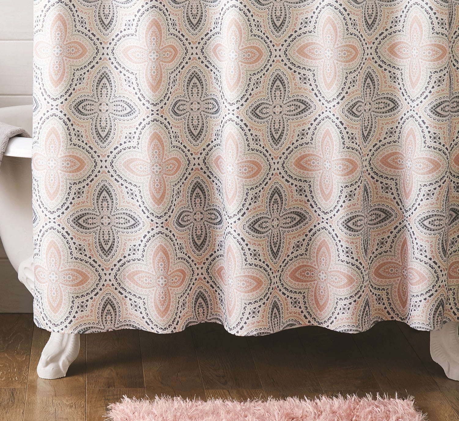 This beautiful and elegant Better Homes & Gardens is a perfect way to update your bathroom decor. The soft and neutral tones make for a perfect way to match most color palettes and other bath decor. The all-over printed shower curtain shows beautiful paisley medallions. The Better Homes & Gardens 14 Piece Candice Bath Set includes a shower curtain, one eyelash bath rug, and 12 roller ball hooks. The twelve roller ball hooks make for the shower curtain to glide easily while stepping in and out of the shower.