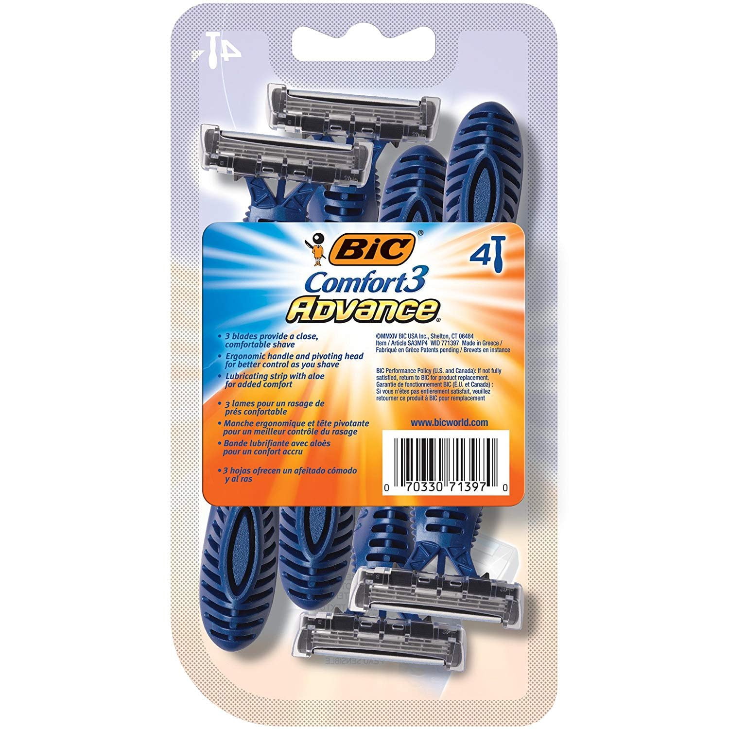 Enjoy a close, comfortable shave with the BIC Comfort 3 Advance Men’s Disposable Razor. Featuring three blades, this convenient disposable razor leaves your skin feeling smooth and comfortable. The textured handle and pivoting head offer added control, while the lubricating strip enriched with Aloe and Vitamin E enhances the glide of the razor. This package contains four disposable razors.
