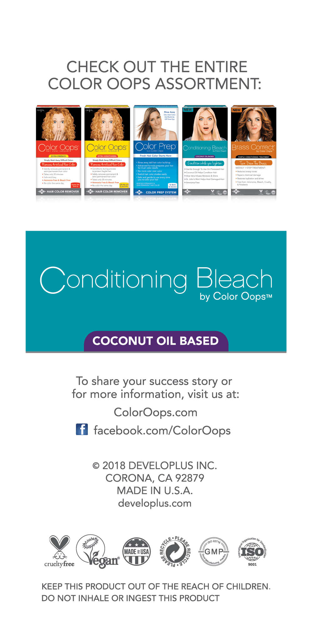 Color Oops Lightening and Conditioning Bleach will get your hair healthy, prepped, and primed for whatever hair color you’re dreaming up next. This one-time application kit includes deep conditioning bleach, 20 Volume Oxide, gloves and single use shampoo and conditioner for ultimate strength and shine. Our unique Aloe Vera and Coconut Oil formula is gentle enough to use on hair that’s been processed or bleached in the past, and won’t cause further damage. This bleach is easy to apply and conditions while it bleaches, keeping your hair smooth and adding a light glow to your style. Use regularly to keep light color fresh and bright. Two kits may be required for very long or thick hair, and for the best results, keep the bleach in for 45 minutes. The power of bleach is in your hands. What color will you choose?. What is Color Oops?. Color Oops Hair Color Remover, it’s a revolutionary hair product that removes hair color to restore hair to its natural color. This is a miracle product because not only can it remove unwanted color, but it won’t damage your hair!.