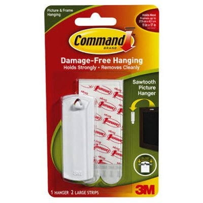 Saw Tooth Picture Hanger With Command Adhesive, Holds Firmly Until You WAntique To Take It Down, Removes Cleanly & Is Reusable With Replacement Adhesive, A Simple Stretch Of The Adhesive Removes The Hook Without Damage, Package Contains 1 Hanger & 2 Command Strips.Command Saw Tooth Picture Hanger 1 Pack