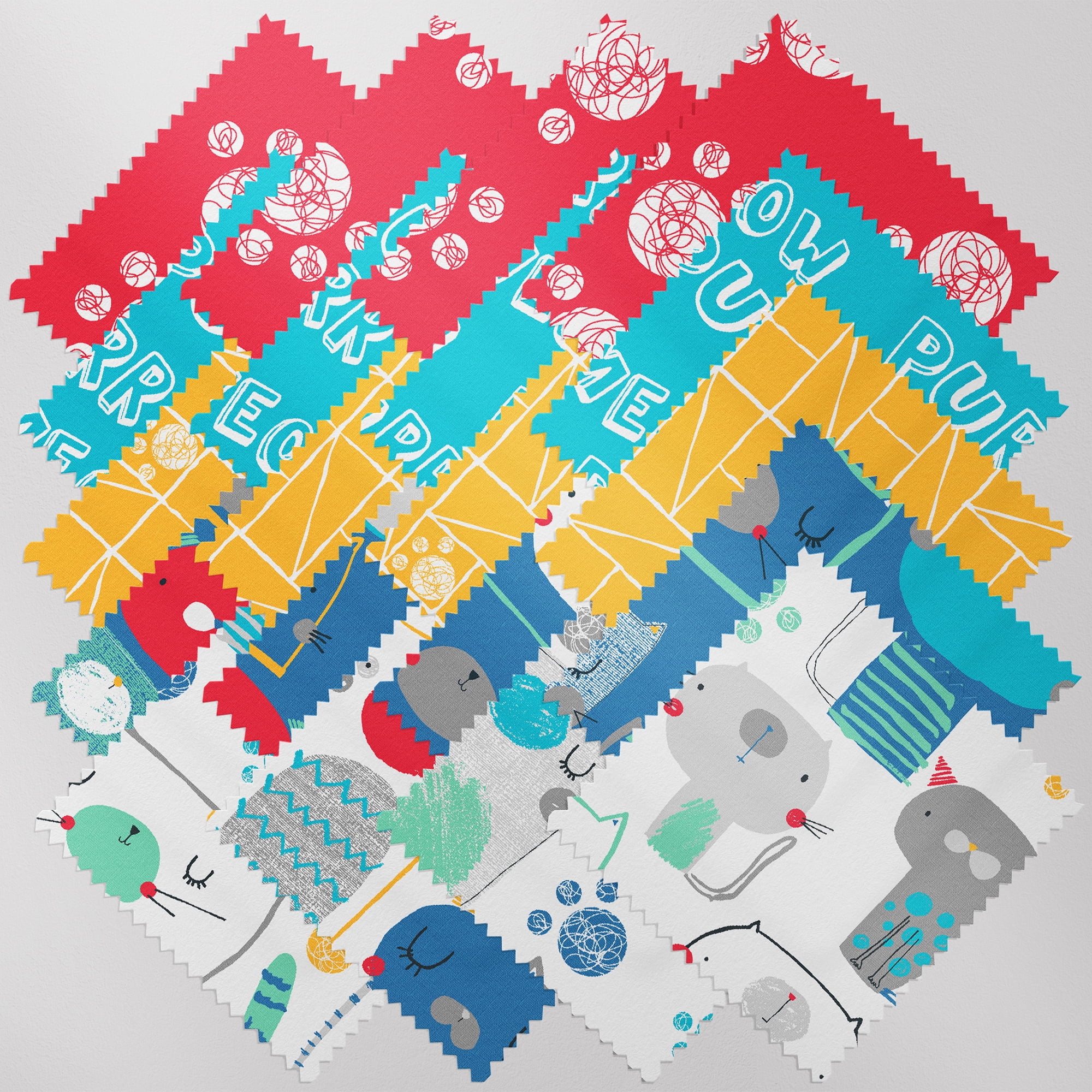 This Cutzie Cat, 20-piece square collection features 5 designs, 4 pieces of each, pre-cut to 5" x 5", 100% Cotton in coordinating designs. Patterns include playful cats and paw prints in PURRRfect shades of red, yellow, blue, and turquoise.