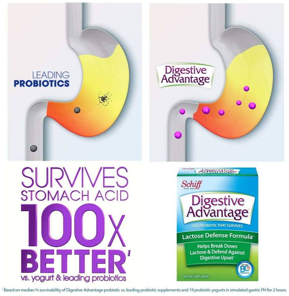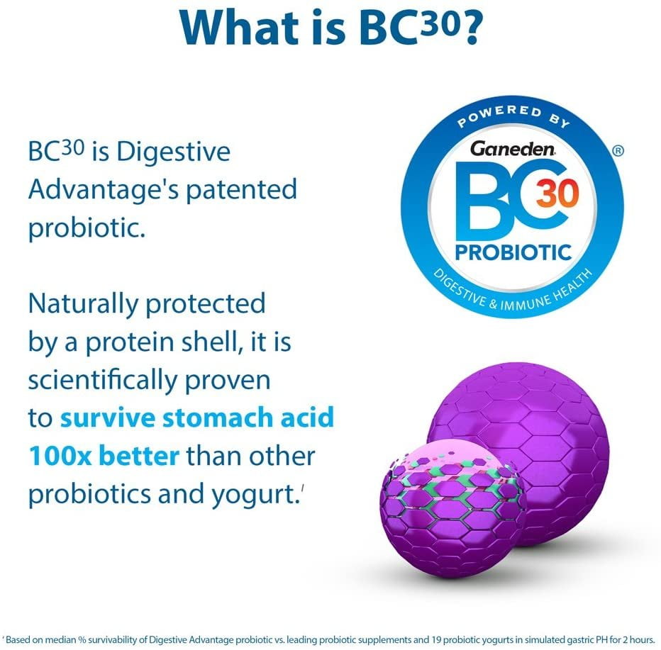 - BC30, the probiotic in Digestive Advantage, survives stomach acid 100x better than leading probiotics and yogurts