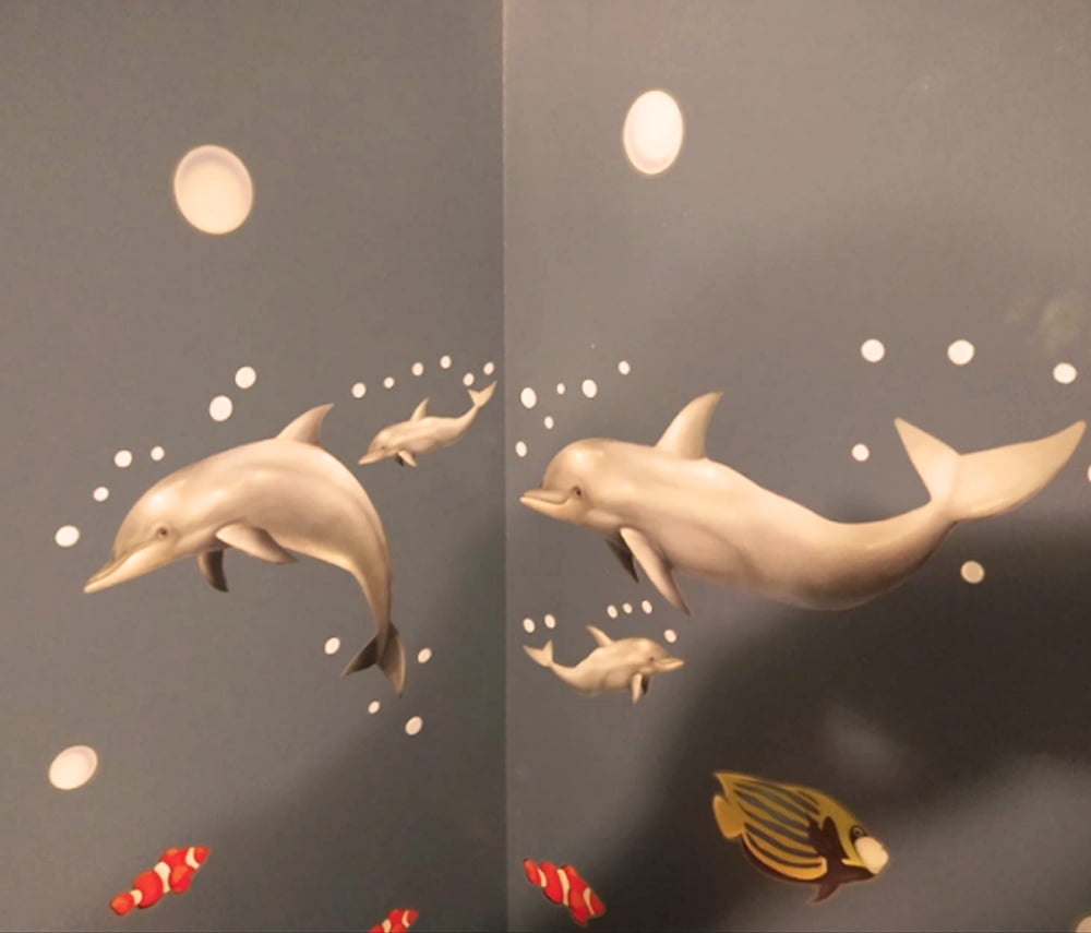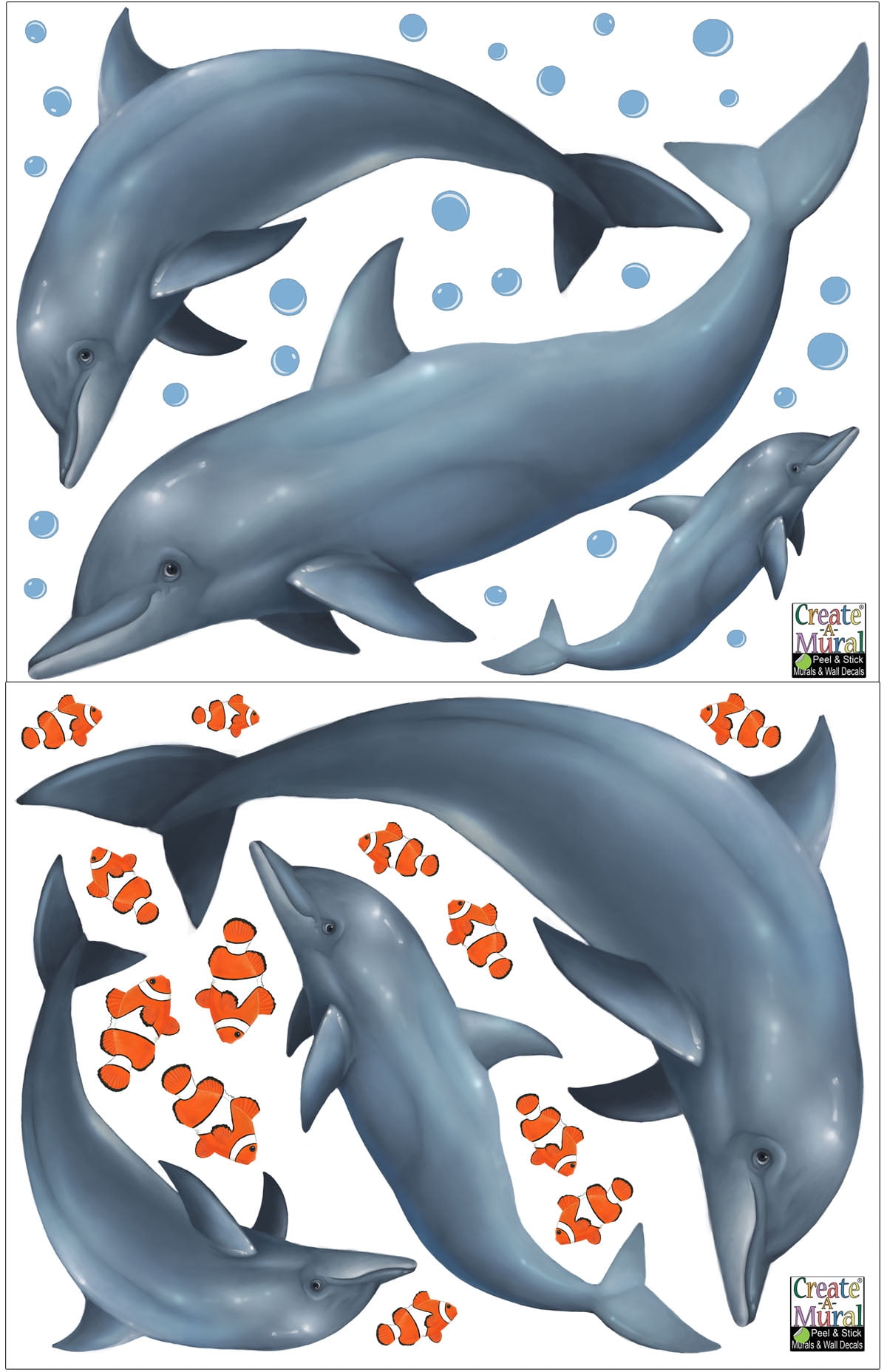 - A Fun Family of Dolphins Kids Rooms Design:(43) Individual Vinyl Wall Stickers(6) Dolphins from 7"-17" w/ Small Clown Fish & Bubble Decals