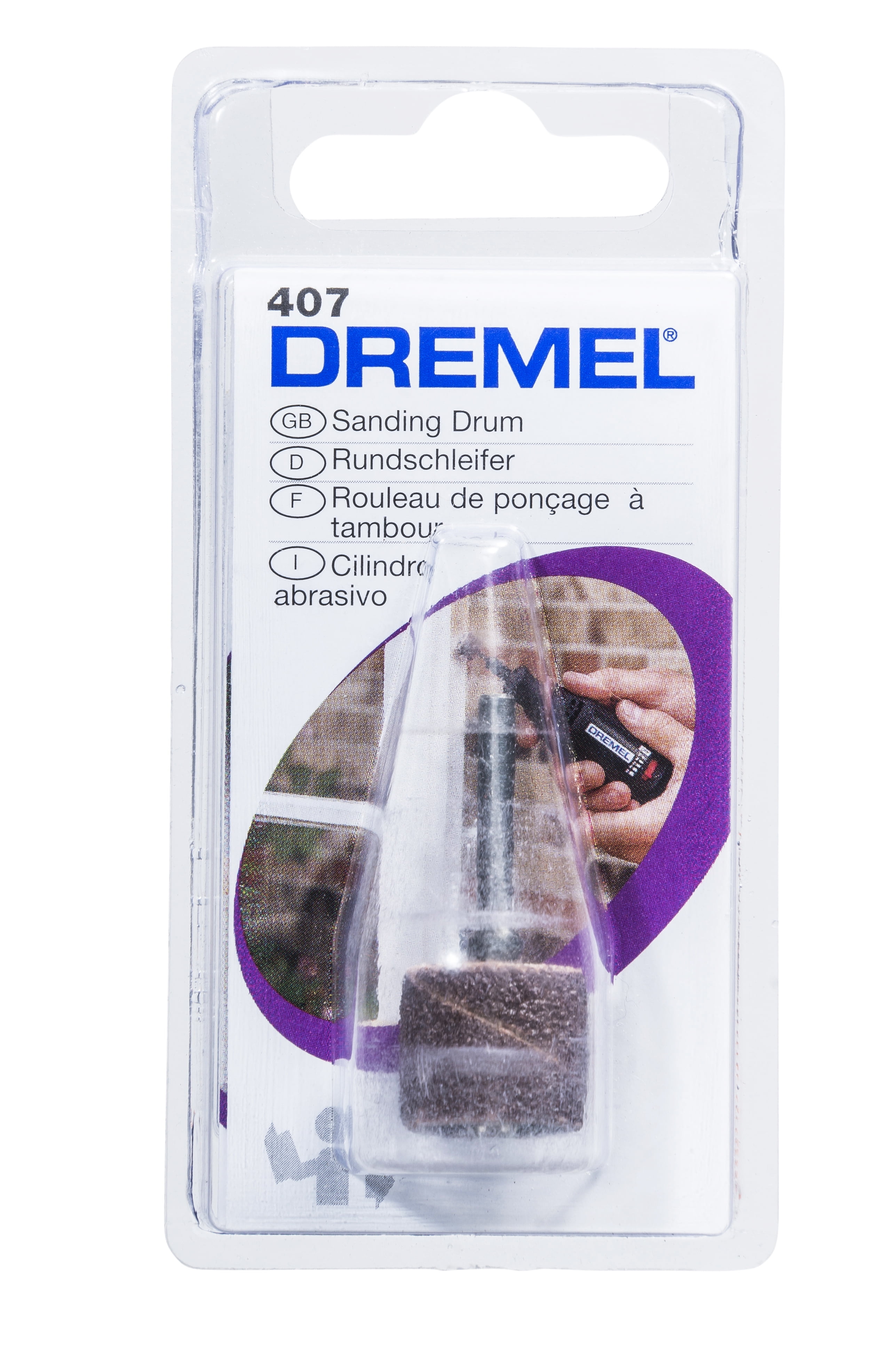 The Dremel sanding drum mandrel holds a sanding band covered with an aluminum oxide abrasive. Sanding bands used on the sanding drum mandrel are sold separately. ½-inch bit diameter.