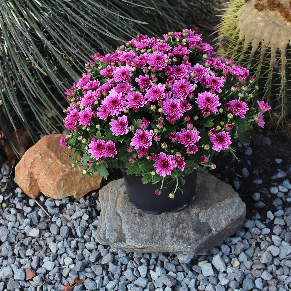 This perennial favorite defines autumn. Chrysanthemums, lovingly known as mums for short, provide memorable late season splashes of color for all your fall decorating, which you won’t soon forget. Bold blooms in a wide variety of hues are excellent for borders, containers, and cuttings. This will include 1 pink colored 1G mum. Planting & Care Instructions: Mums look beautiful as flower borders or in containers around your porch, patio, or near your front door. If replanting into a larger pot, use quality soil. When planting in the garden, dig a hole, set the plant and fill hole with soil. Keep well watered until the plant is established. Water well when dry, and check often during hot, dry weather. Fertilize regularly.
