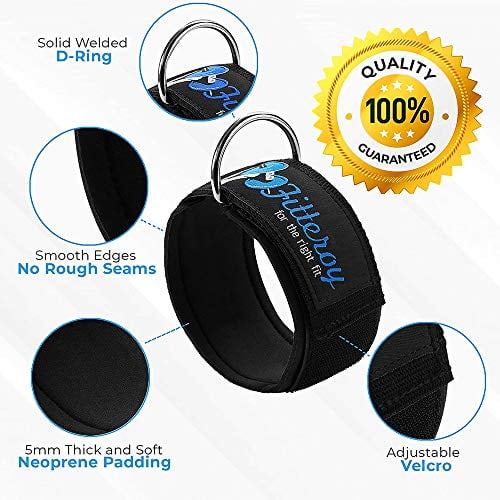 INCREASE YOUR WEIGHTLIFTING capabilities with proper equipment and accessories. Do you want ankle straps that will make you look forward to leg day? Fitteroy ankle straps are made with you in mind. We use only the best quality materials to create a strap that features comfort, strength and durability combined. SUPER COMFORTABLE; DOES NOT DIG INTO YOUR SHINS No rough edges from trimmings or hemlines. The neoprene padding is smooth and soft. You will not feel the heavy duty steel ring while working out. The industrial strength velcro stays closed and straps do not move up and down. In Fact, The straps are so very comfortable that you might forget to take them off! TIGHTEN YOUR GLUTES AND HAMS WITH QUALITY STRAPS Fitteroy ankle straps are essential for doing your leg extensions, leg curls, cable glute kickbacks, weighted crunches and hip abductors/adductors. Maximize your lower body exercises by focusing on glutes and hamstrings. Re-energize your body by stimulating all essential areas like hips, thighs, knees and ankles. Working your glutes can also help boost your strength on compound lifts and help prevent back injuries! Getting your glutes firing correctly is key for doing squats, deadlifts, and other compound lifts. Underactive glutes are a common issue which at best cause bad form, but in the worst case can eventually lead to injury! FOR HIM AND HER The Fitteroy ankle straps feature extra strong long lasting velcro closures that adjust to all sizes from small to large. Great for men and women! SOLD CONVENIENTLY IN A SET OF TWO; THERE IS NO NEED TO SWITCH ANKLES. Make leg exercises enjoyable and easy with FITTEROY TOP QUALITY ANKLE STRAPS! EASE OF USE Attaches easily to cable systems, resistance bands, functional trainer workout equipment, and home gyms. Great for use as a portable fitness companion with resistance tubing and exercise bands.
