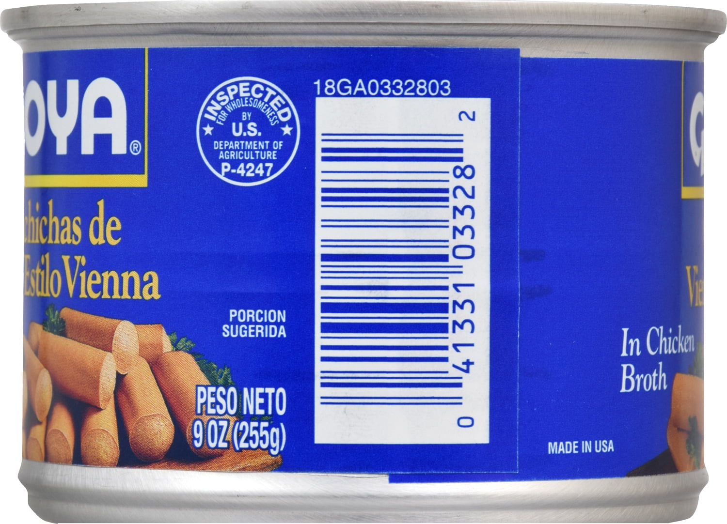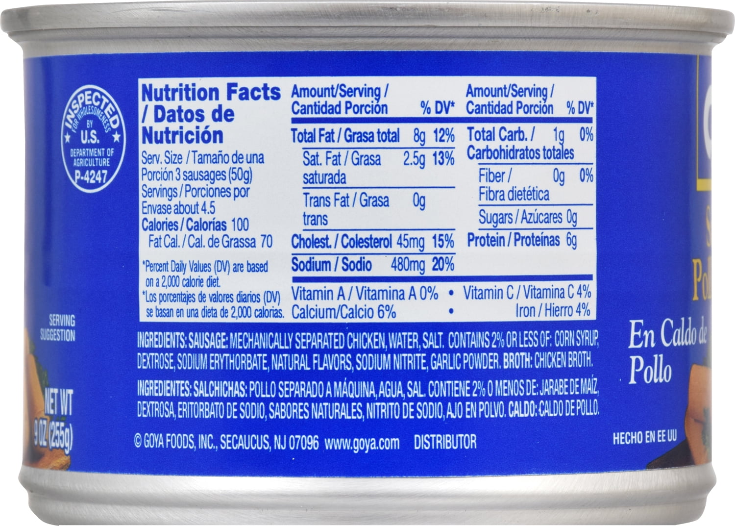 GOYA Chicken Vienna Sausage In Chicken Broth 9 Oz. Enjoy the delicious flavor of Goya Vienna Sausage. Delicately seasoned and packaged in chicken broth, it is ideal for using in various recipes. You can also eat them right out of the can for a quick snack. Inspected for wholesomeness by the U.S. Department of Agriculture, the chicken Vienna sausages are a quality food for at home or on the go. They are low in fat, calories and cholesterol and come in an easy-to-open 9-oz can.