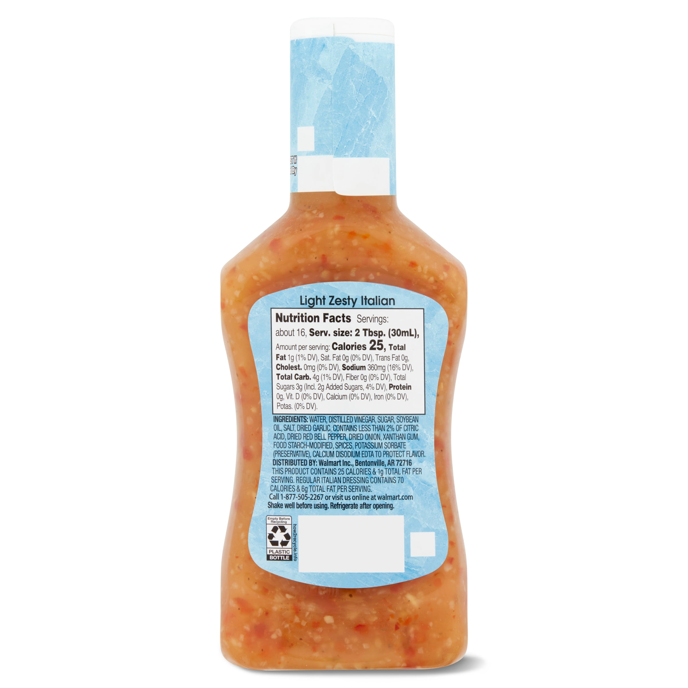 Great Value Light Italian Dressing has a zesty garlic flavor with onion and a hint of bell pepper. In addition to enhancing a traditional green salad, this dressing is great as an ingredient in pasta salads or as a marinade for poultry. Drizzle on handcrafted sandwiches for a kick of wonderful flavor. With only 25 calories and 1 gram of fat per serving, this light dressing has 50% less fat and 33% fewer calories compared to regular Italian dressing. It comes in a reclosable bottle to keep your dressing fresh after every use. Turn any meal into a memory with a drizzle of Great Value Zesty Italian Dressing and Marinade.