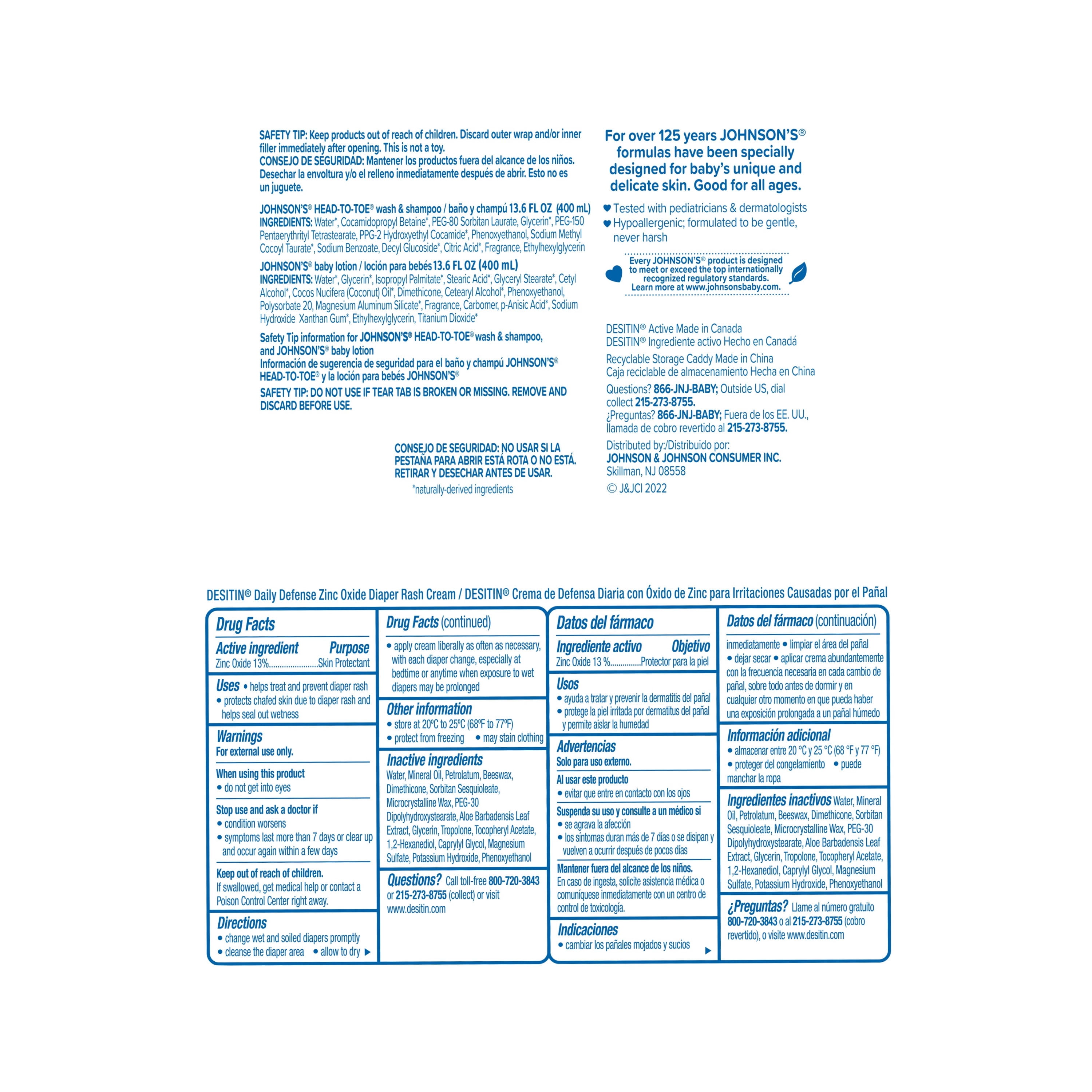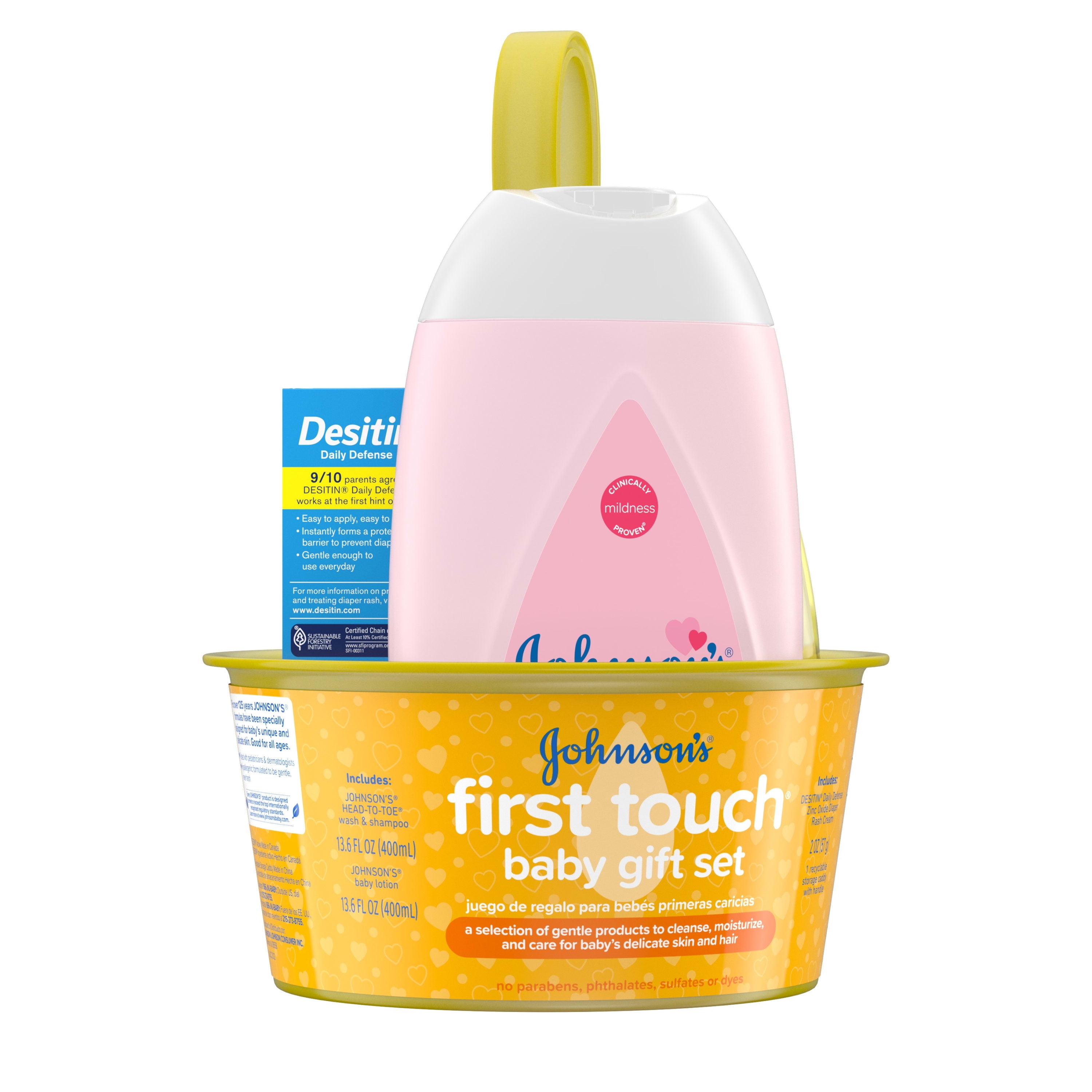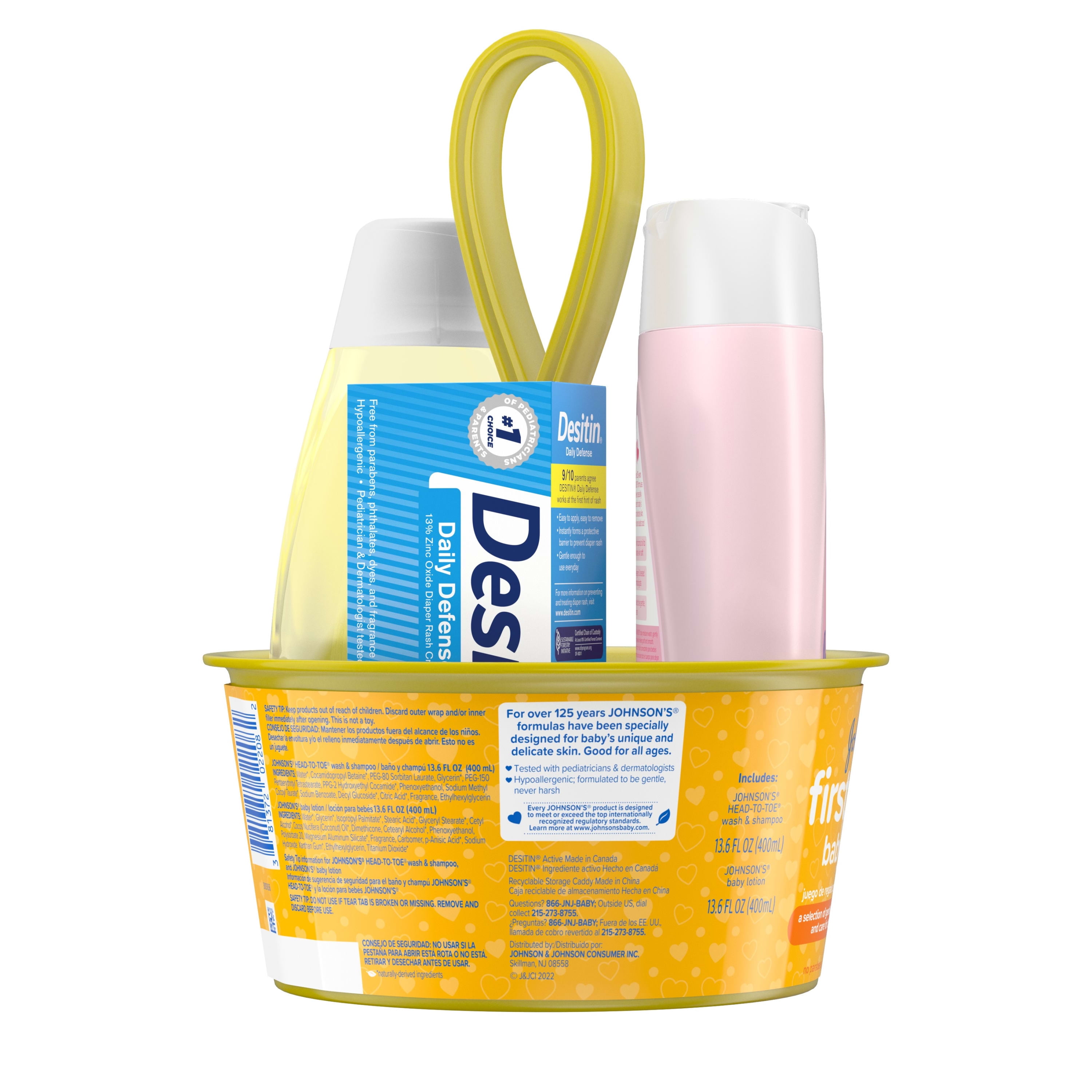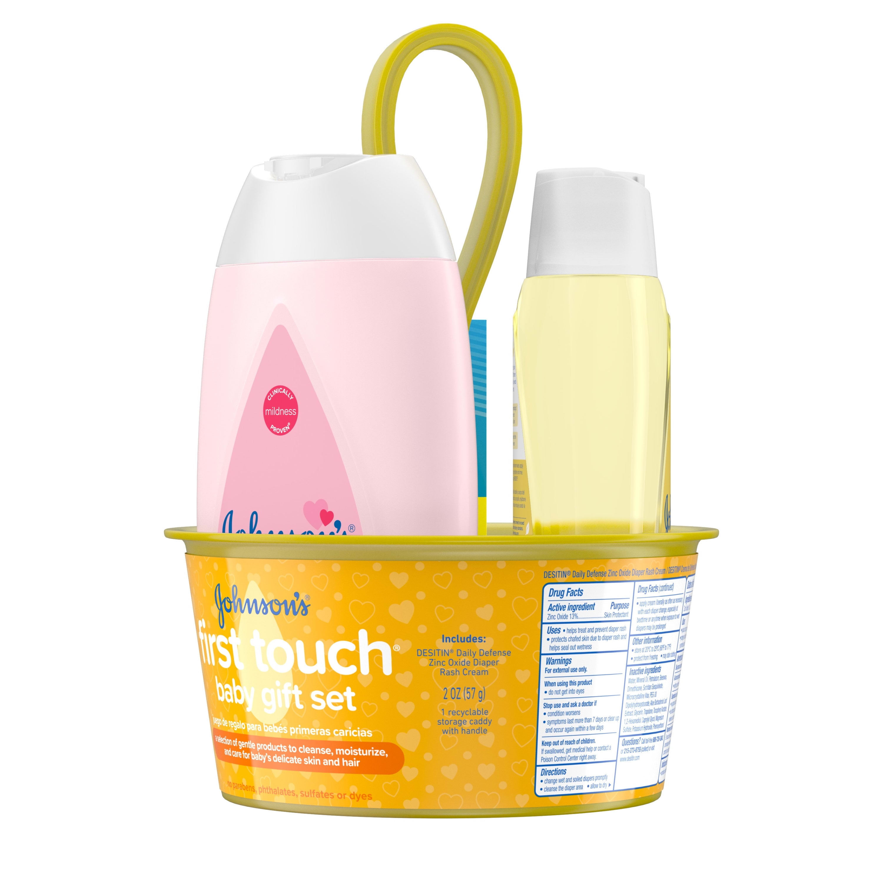 Johnson’s First Touch Baby Gift Set that contains an assortment of gentle products to cleanse, moisturize, and care for your baby’s delicate skin and hair. Specially designed for babies but great for all ages, this newborn and baby gift set of hypoallergenic baby essentials contains baby body wash and shampoo, baby lotion, and diaper rash cream, all tucked into a reusable bath caddy with handle. Every product in this gift set designed with input from moms like you and is pediatrician-tested. Our products are made with no dyes, no sulfates, no phthalates, and no parabens. This baby bath set makes a great baby shower gift for soon-to-be parents for any in-person or virtual baby shower.