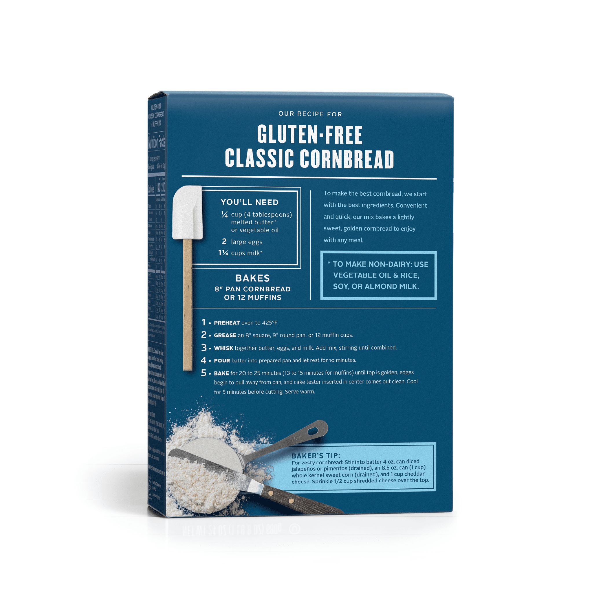 Go for the gold(en) loaf. his golden, tender cornbread is easy to prepare with our mix (we’ve measured and mixed the same great ingredients you love for you!), loaded with whole grains (that means good and good for you) and is difficult to resist (trust us, we’ve tried). The mix, made with whole sorghum flour and whole millet flour, makes a slightly sweet cornbread with a moist texture. Perfect alongside soups and stews or with a salad to make it a full meal. Our mixes are carefully crafted in our test kitchen through meticulous taste-testing (it?s a tough job, but we?re up to the challenge!) and blendingto replicate our favorite recipes.The result? Mixes that make the finest gluten-free baked goods around. Simple ingredients, reliable results, and deliciousness that everyone can enjoy!-14 oz. mix makes an 8" pan of cornbread or 12 corn muffins Certified Gluten-Free by the non-profit Gluten-Free Certification Organization (GFCO), a program of the Gluten Intolerance Group (GIG®) Non-GMO Project Verified Kosher Includes 10g whole grains per serving Instructions are included to make the mix non-dairy
