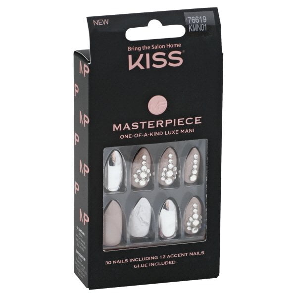 NEW Masterpiece ONE-OF-A-KIND LUXE MANI takes minutes to apply, features chrome and marble designs and jeweled accents, and comes in the latest stiletto shape . • Simply glue-on and wear for up to a week to create a custom, bold look. • Kit contains 30 Nails including 12 Accent Nails, Pink Gel Glue 2g (0.07 oz.), manicure stick, mini file.• Glue on nails stay on for up to a week. • Kit contains 30 Nails, Pink Gel Glue 2g (0.07 oz.), manicure stick, mini file.