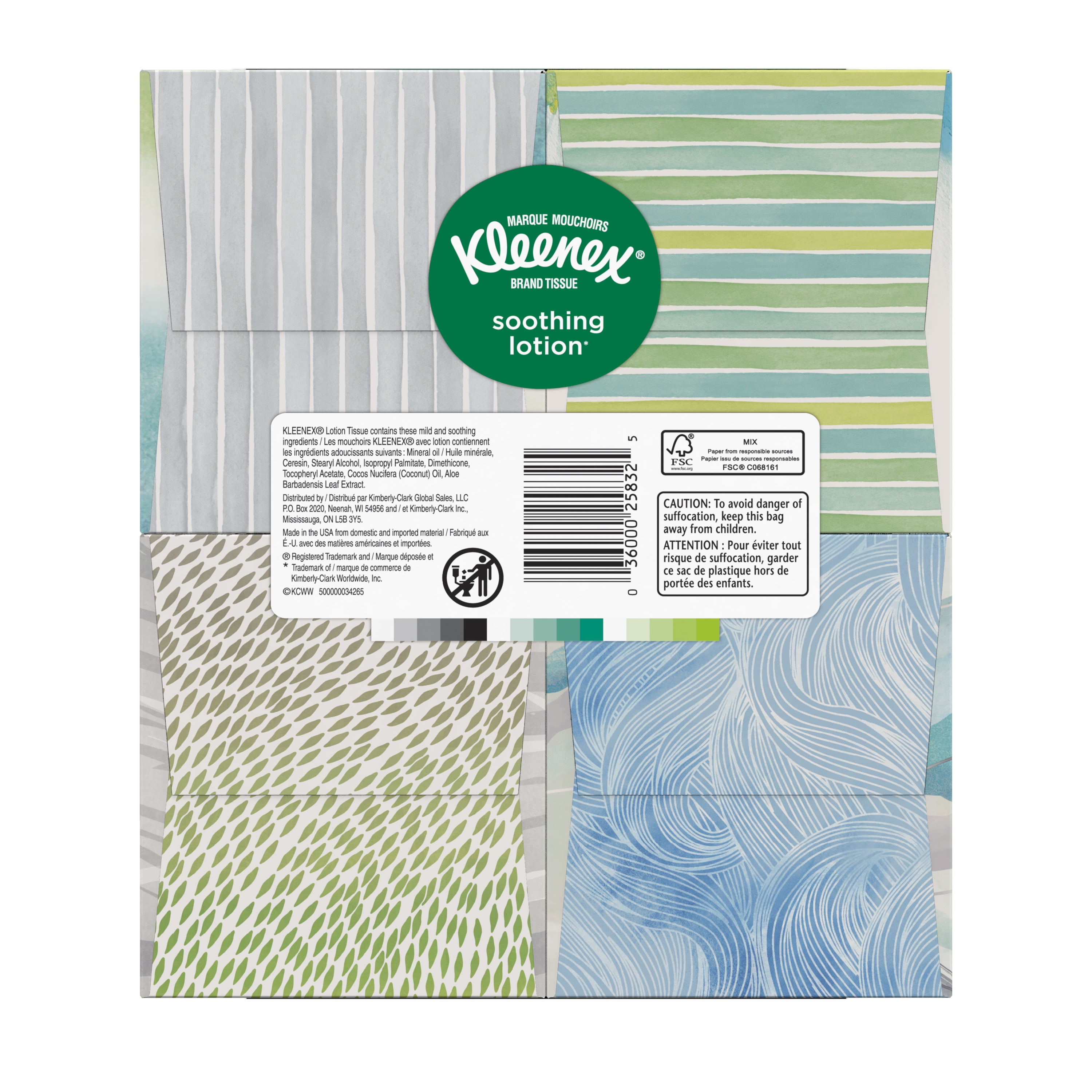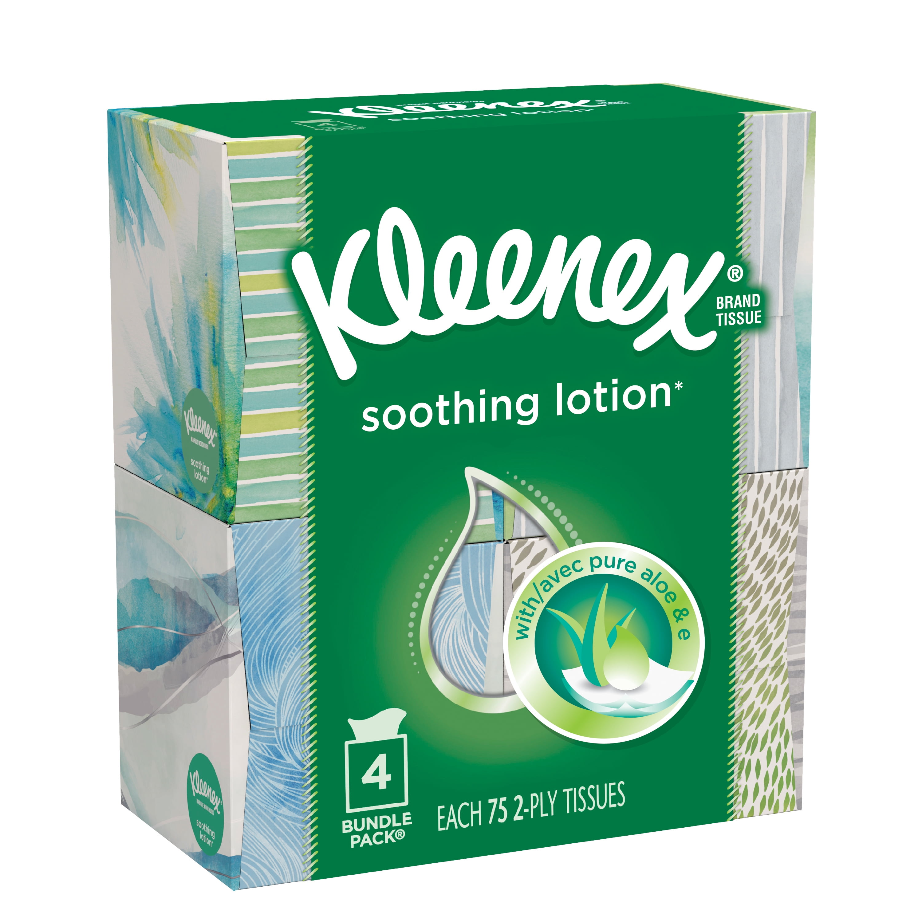 One soft tissue is all it takes to show you care. Reach for gentle, soothing, fragrance-free Kleenex Tissues with Lotion for a friend, a stranger, or yourself. Delivering strength and indulgent softness, Kleenex facial tissues with lotion feature moisturizing aloe vera and vitamin E for delicate skin and 2-ply thickness for durability. And as always, enjoy the absorbency you expect from Kleenex tissues with every tissue in the box. Stock up on Kleenex Tissues with Lotion and keep tissues on hand to care for family, company, and yourself during cold and flu season, allergy season, back-to-school, and holidays. Kleenex boxes come in a variety of colors and designs that blend beautifully into your home decor. Place boxes in the living room, kitchen, bathrooms, bedrooms, and office.