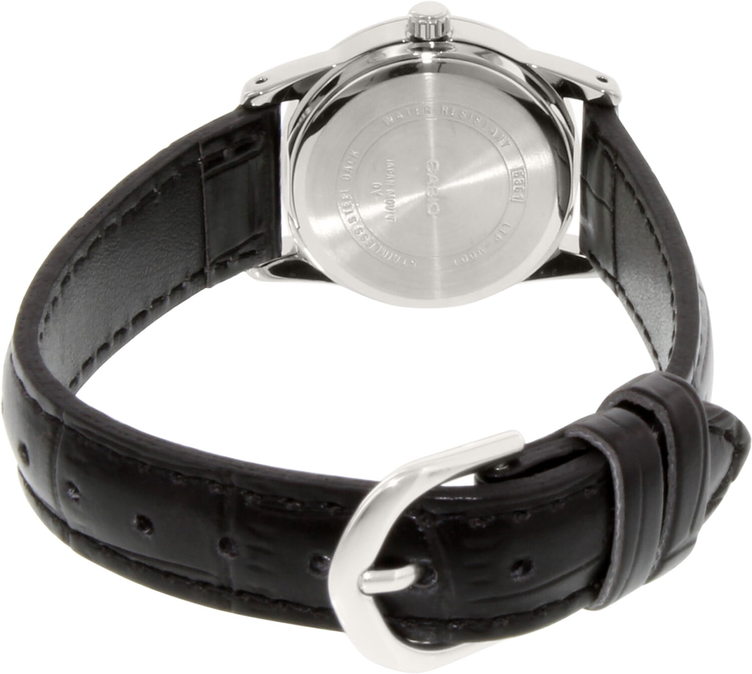 Stainless steel case. Leather strap. Silver dialQuartz movement. Splash resistant. Case 31 mm.Casio Leather Ladies Watch LTP-V001L-7B