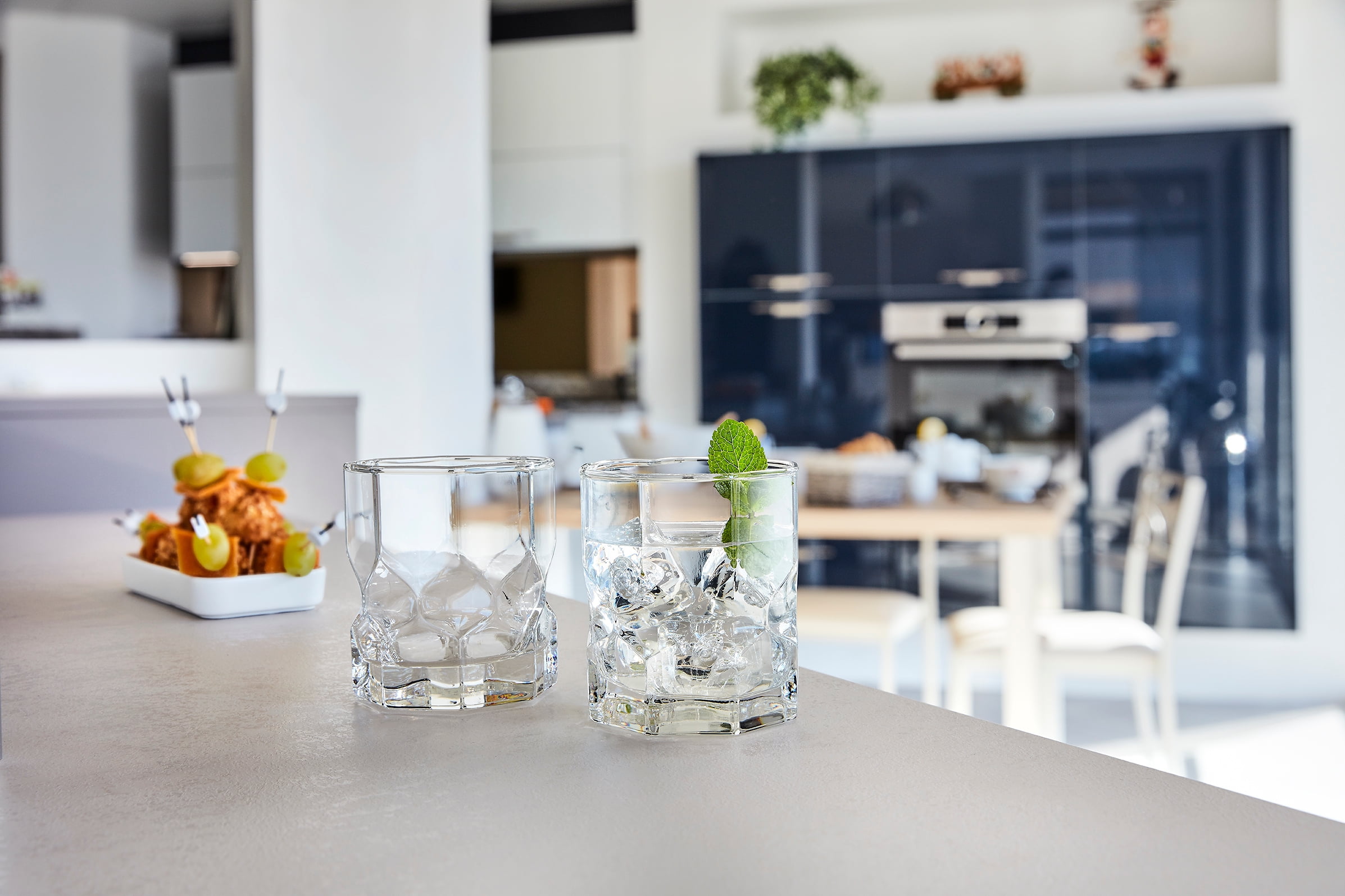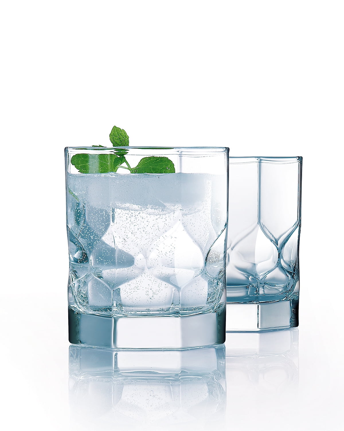 Like a precious gem, our Topaz barware features a geometric, faceted motif. With these on-the-rocks glasses, the angles create a unique octagonal shape that is intriguing to both the eye and the hand. Beveled rims complete the intriguing look. Its structured, singular pattern makes this a refreshing everyday glassware set.