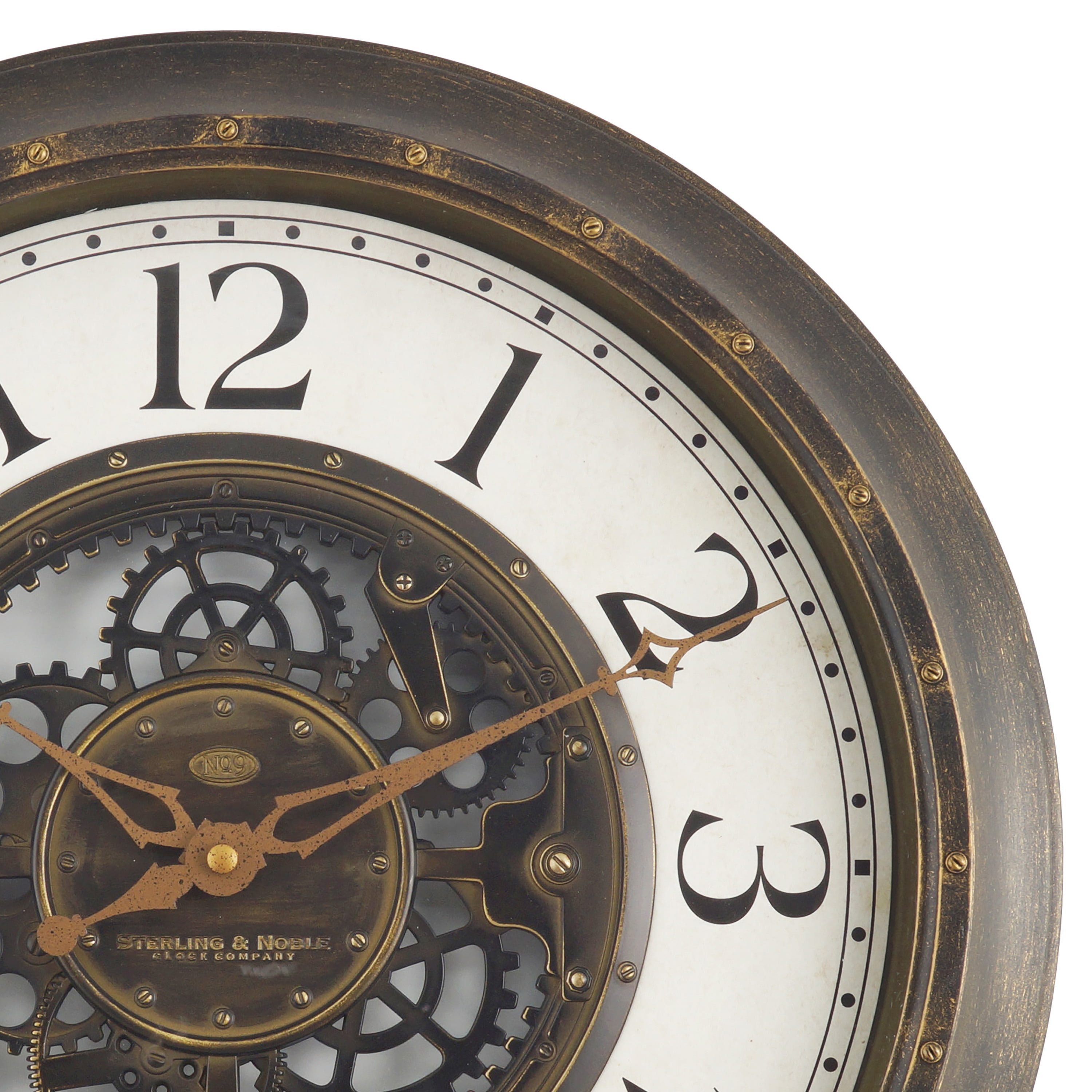 Incorporate design into your space with this stunning Mainstays 15.5" gear wall clock. The lightweight frame features an aged bronze finish. The dial of the clock has bold Arabic numerals, minute track and decorative gear element located in the center. The decorative gears are finished in an aged bronze color and adds a dimensional quality. The wall upon which this clock is hung is seen through the decorative gears. Shapely hour and minute hands complete the design of this clock.
