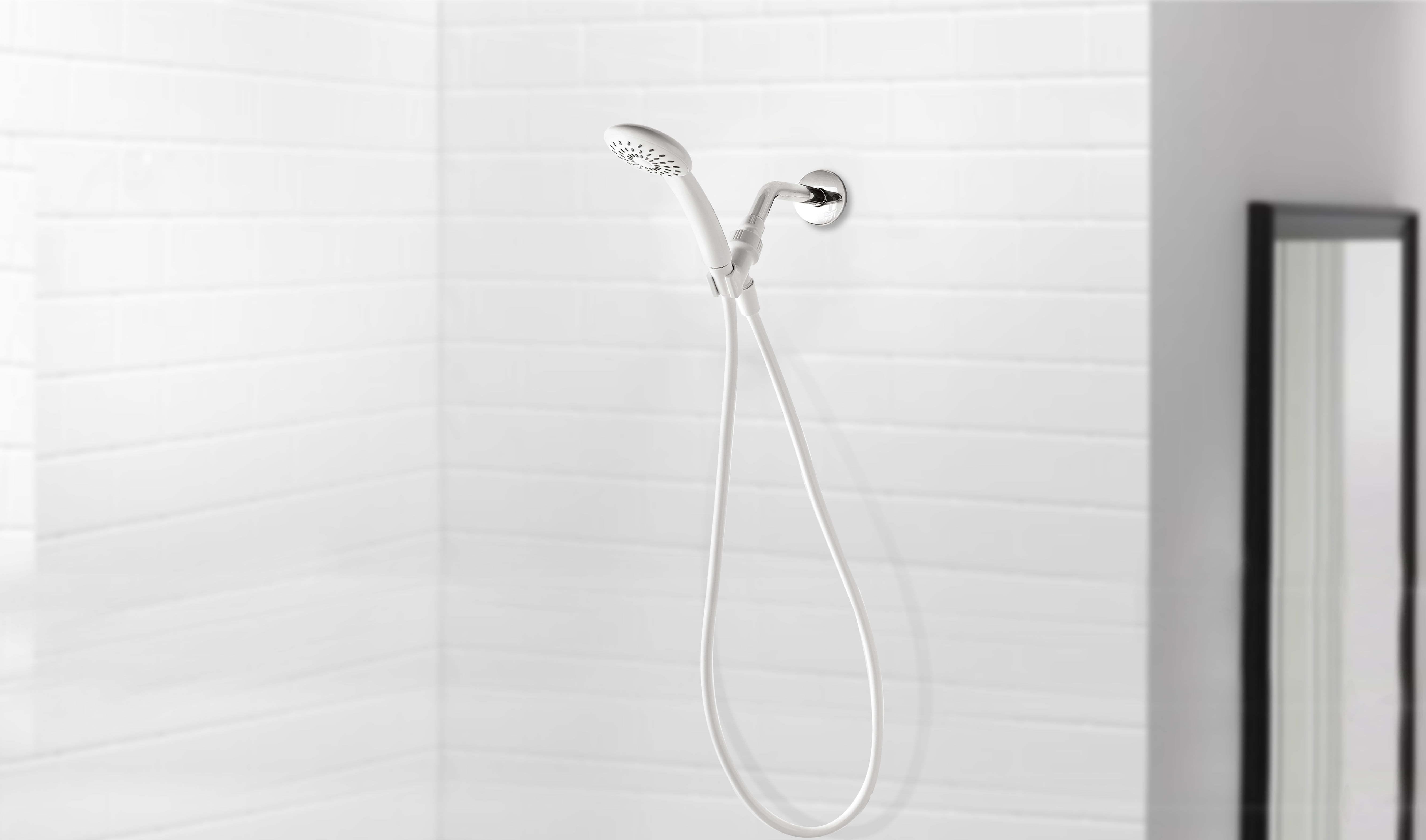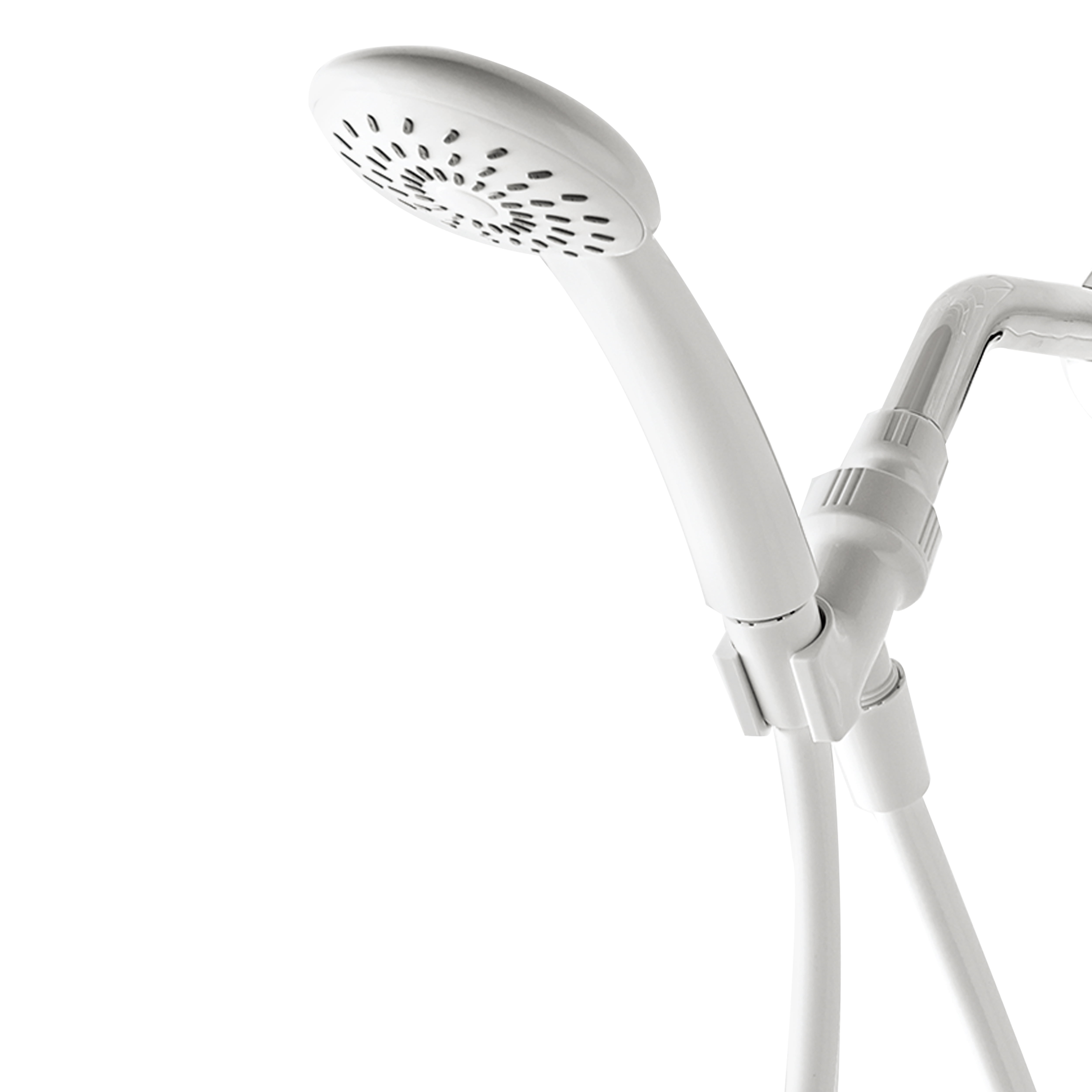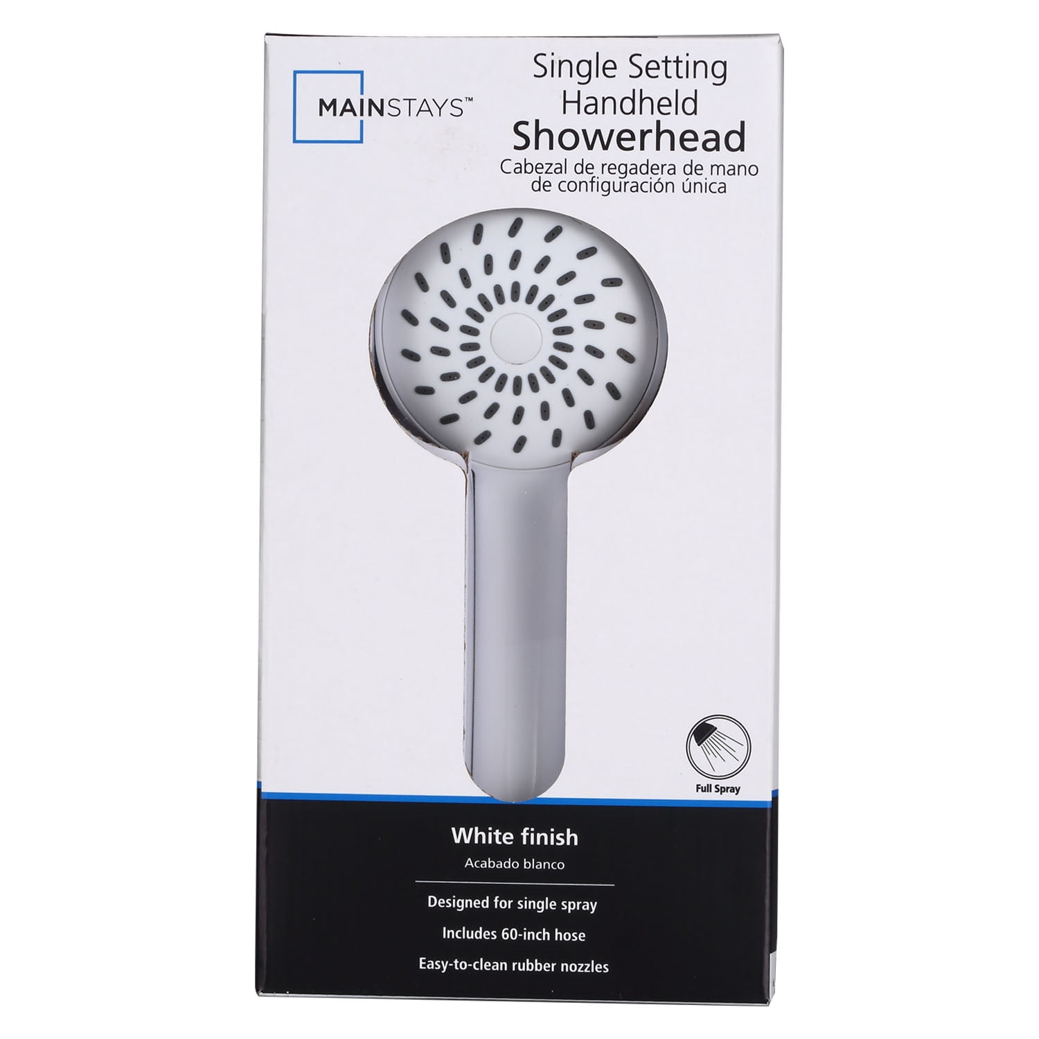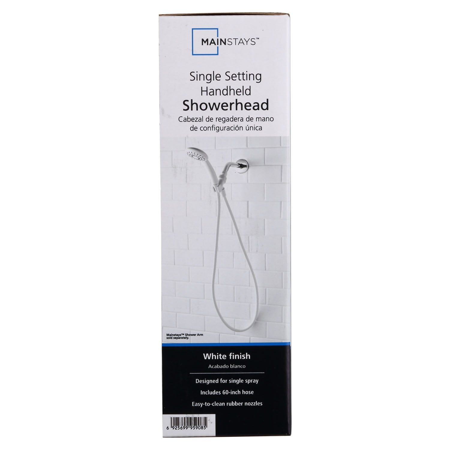 The Mainstays handheld shower head in white offers the latest in style, design and performance. This set includes the bracket with a anti-swivel lock nut that prevents loosening and leakage, which meets common for industry standards. The shower head features the latest in ergonomic design with a 3.6-inch white face. You can install this product with confidence knowing that Mainstays provides a lifetime limited warranty. Mainstays White Handheld Showerhead W/ Hose & Shower Mount