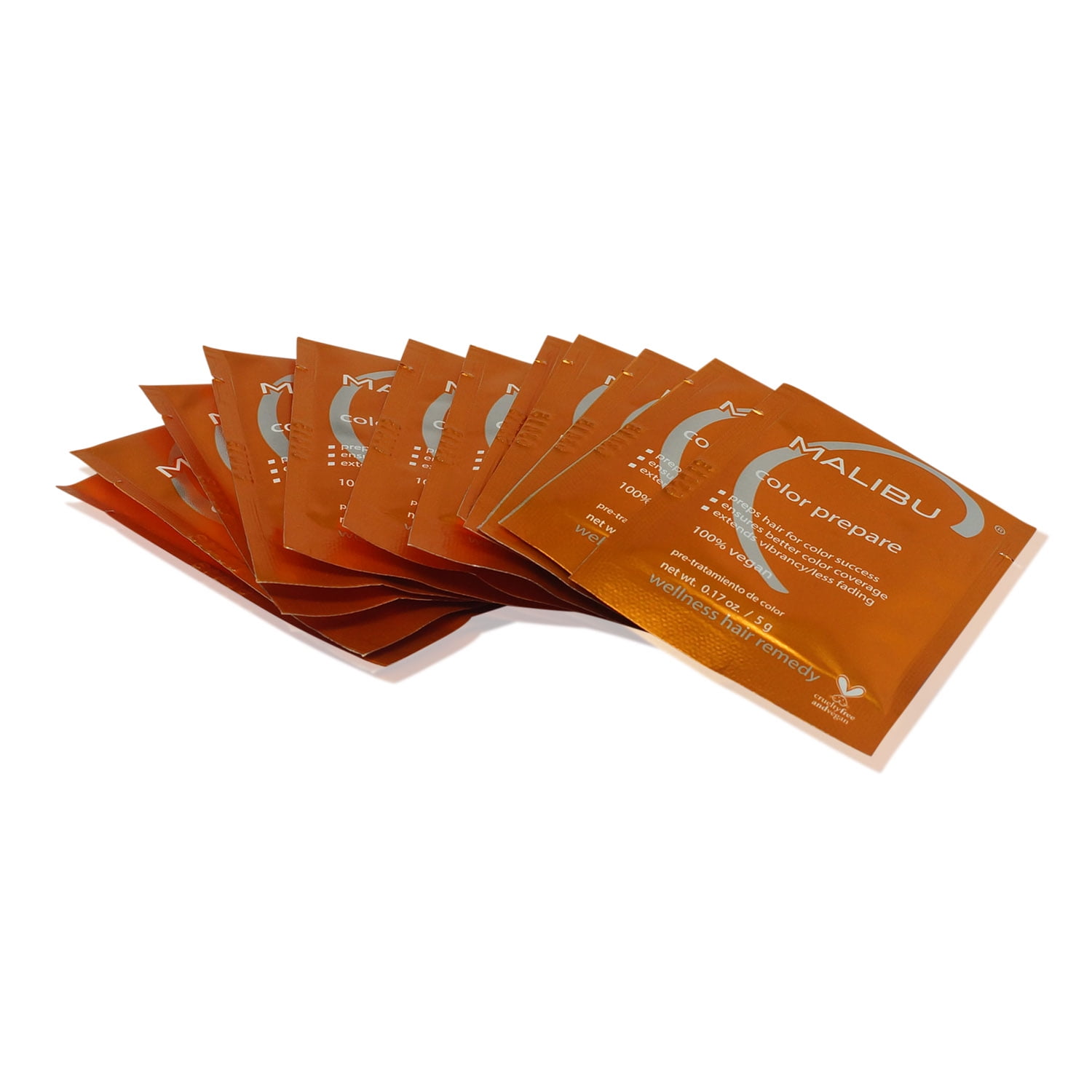Natural wellness treatment formulated with a patented vitamin complex. Prepares hair for superior color.Gently yet effectively removes minerals from hair that inhibit proper processing of color. Extends life of vibrant color to prevent fading.Helps prevent brassiness or discoloration. Accelerates processing time of color.Protects scalp from itching or burning caused by oxidizing chemicals. Sulfate-free, paraben-free, propylene glycol-free, gluten-free, 100% veganWe recommend a Malibu MakeOver® hair service at your local salon to achieve maximum resultsA patented, fresh-dried vitamin complex that dissolves into a gel in the palms of the hands forming a rich lathering treatment specifically formulated for hair prior to every color service in the salon, at home or when traveling to assure predictable and successful color results.Malibu C Color Prepare 1 Step to Perfect Color 12 Packets