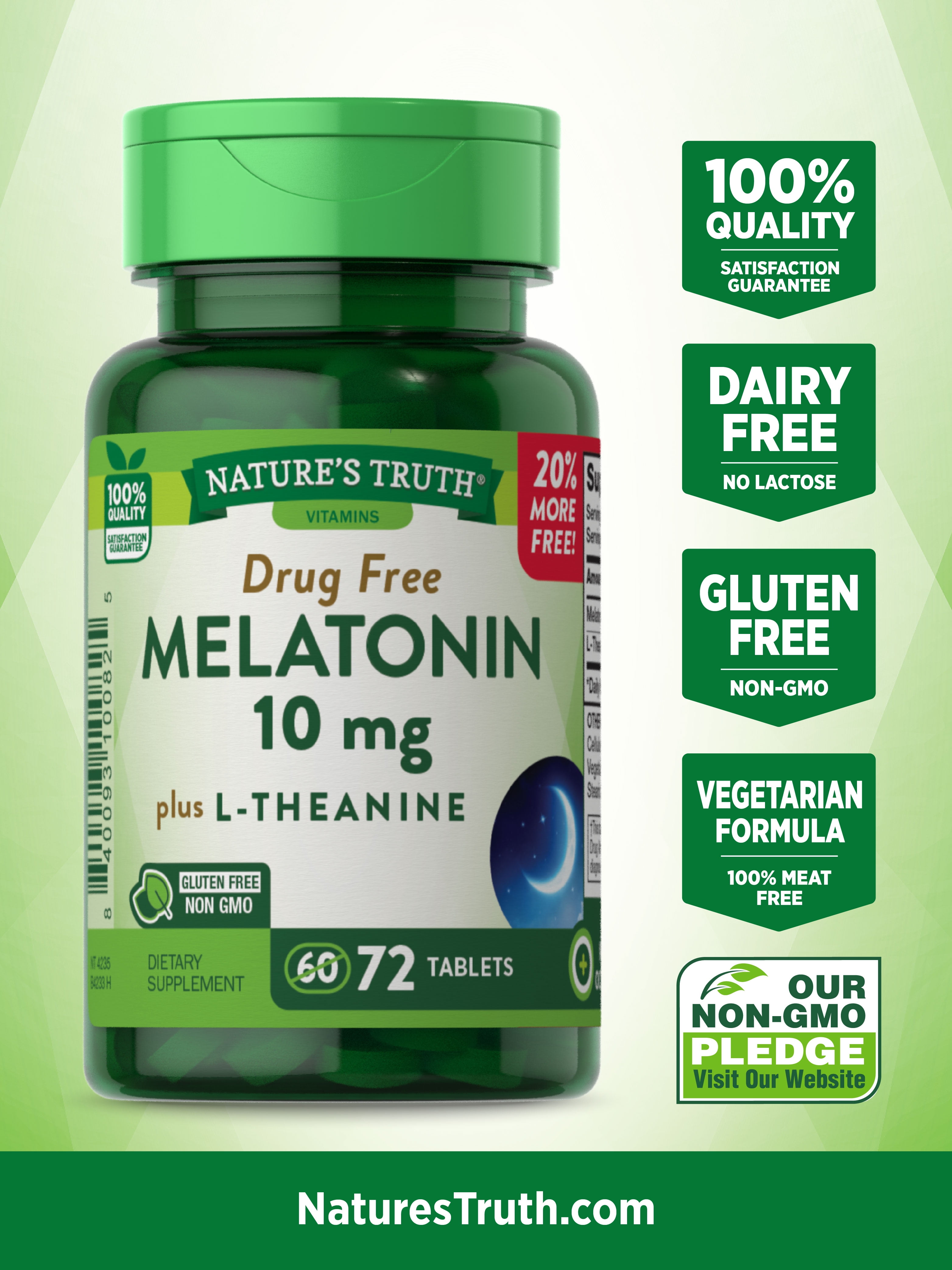 What is Melatonin? Melatonin is a hormone that’s naturally occurring in the bodies of both men and women. It’s also found in various nutritious foods, mainly fruits and vegetables. This nutrient is utilized in wellness traditions through dietary supplementation. It’s often combined with other soothing ingredients like L Theanine and Valerian Root for a synergistic effect that is most known for acting as a sleep aid.* How to get Melatonin: Melatonin is naturally found in fruits and vegetables like Tart Cherries, Tomatoes and Pomegranate. However, most adults turn to supplements to get a concentrated serving. The most common Melatonin supplements include: potent, chewable gummy vitamins, pills, tinctures, jelly, strawberry, or berry flavored gummies, sprays, chocolate supplements, time release capsules, chocolate gummy bear supplements, powder, creams, under tongue liquid drops, extended, controlled, slow, or time release melts, quick dissolve chewables and other high dosage support formulas. Looking for a pure Melatonin supplement from a trusted source? About Maximum Strength Melatonin Nature’s Truth now carries an innovative and enhanced 10 mg Melatonin Extract with 5.5 mg of L-Theanine. However, Nature’s Truth’s Tablets deliver a much higher strength for maximum support. Plus, we’ve included an additional 12 servings in our bottle to add to your savings, for a total count of 72 tablets – a great bulk size! Our Melatonin is backed by a commitment to quality, purity and reliability. Have premium standards? Choose Nature’s Truth brand as your answer for all your supplement needs.
