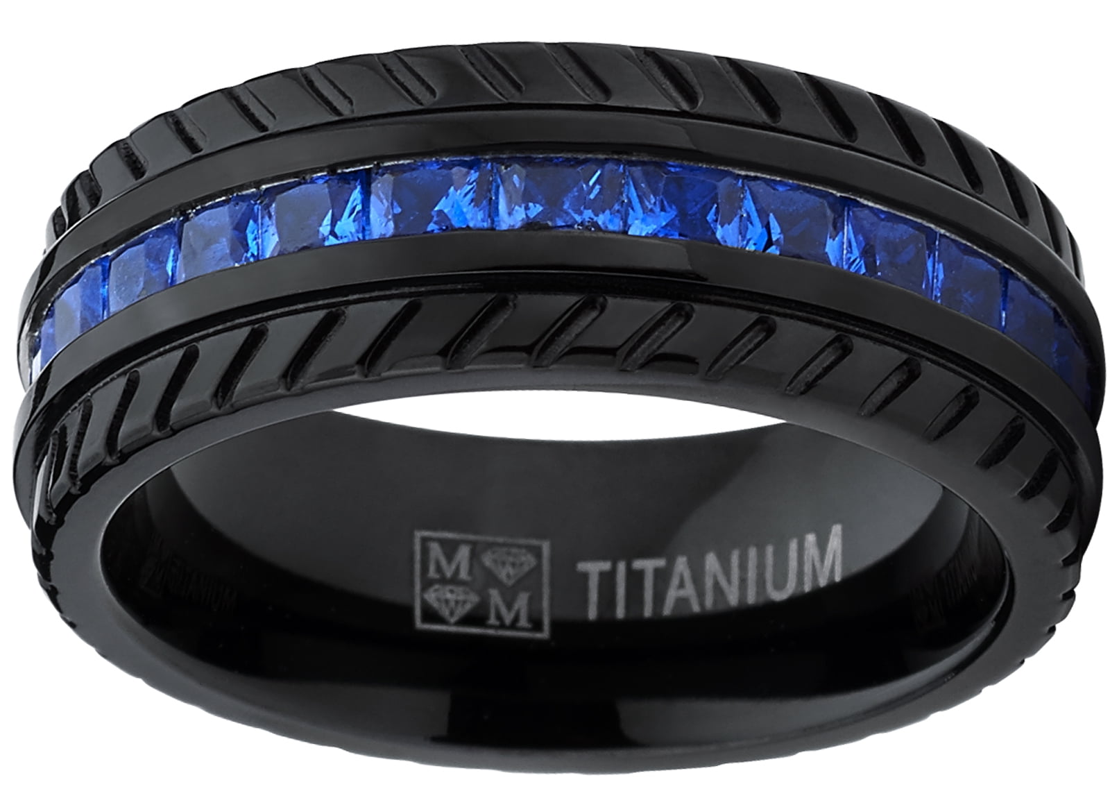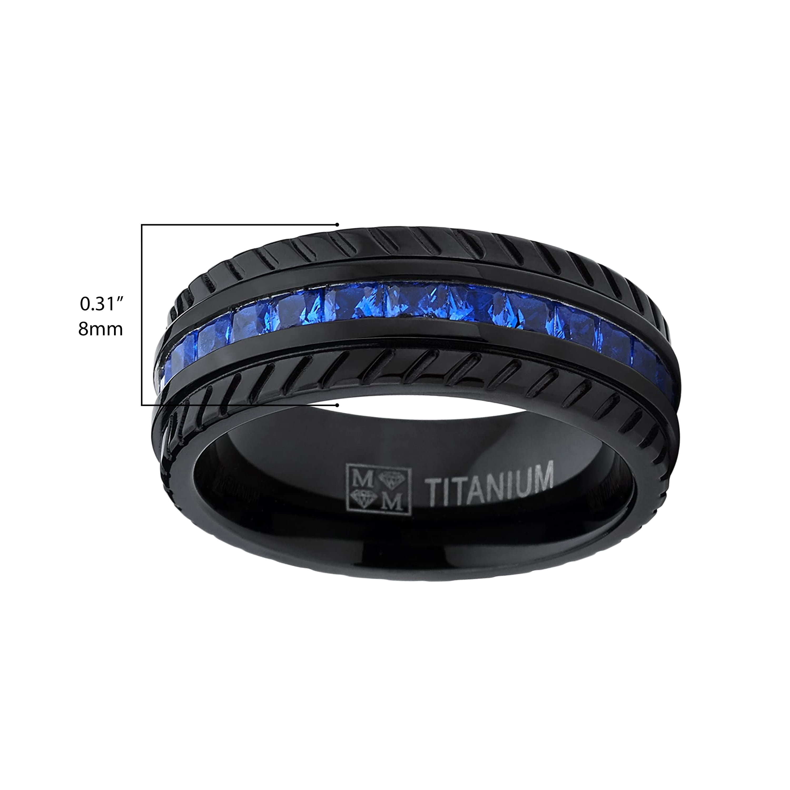 This striking men’s black plated wedding band is crafted of light weight titanium. The wedding band has chevron style crisscross grooves with channel set deep blue princess cut cubic zirconia going around the entire band. The scratch resistant, hypoallergenic, titanium band of this ring is crafted for your comfort. The inner surface of the ring is specially contoured for an even more comfortable fit. The high-polish jewelry finish provides an excellent complement to the beautiful cz stones.Men’s Black Titanium Wedding Band, Engagement Eternity ring W/ Princess Cut Deep Blue Cubic Zirconia CZ 8