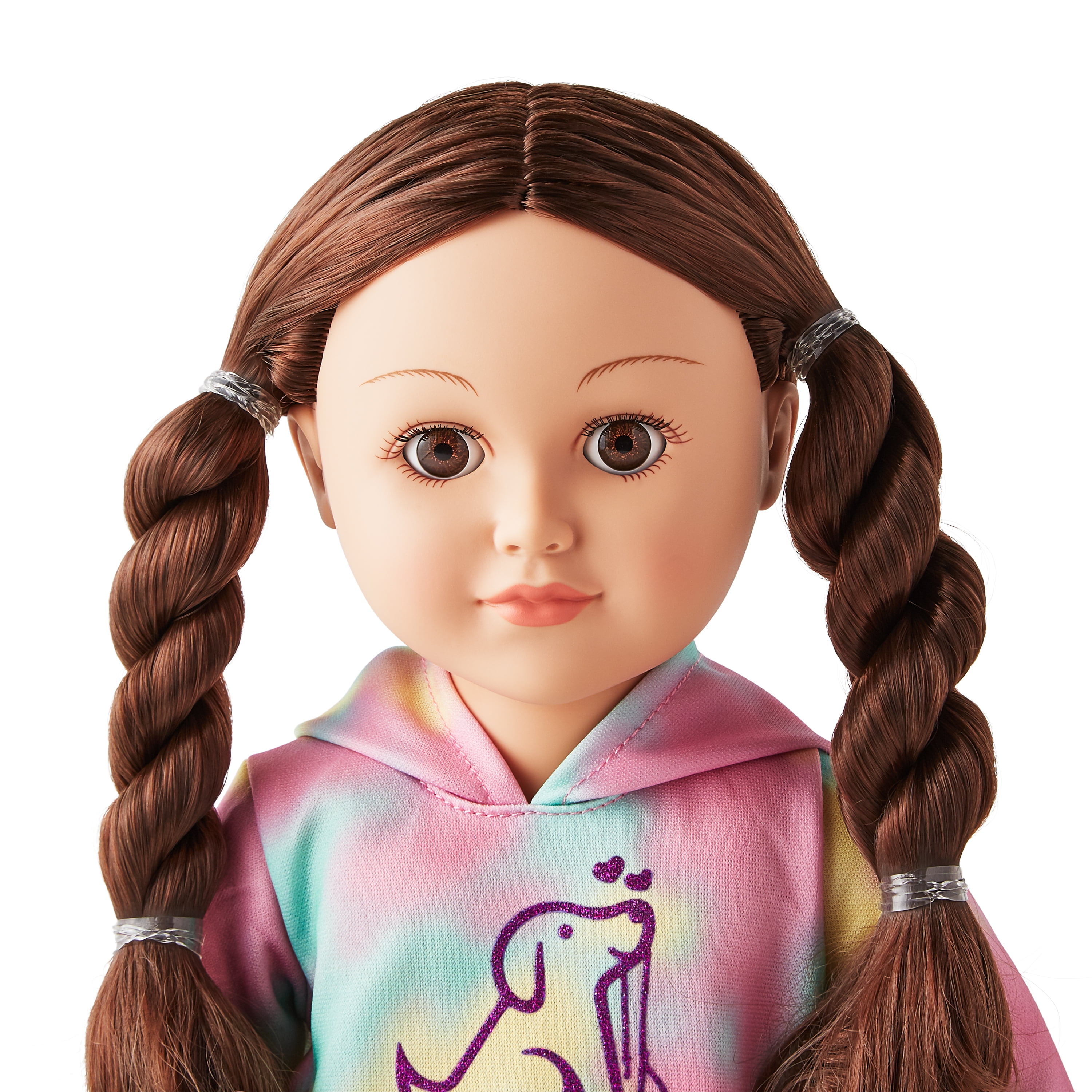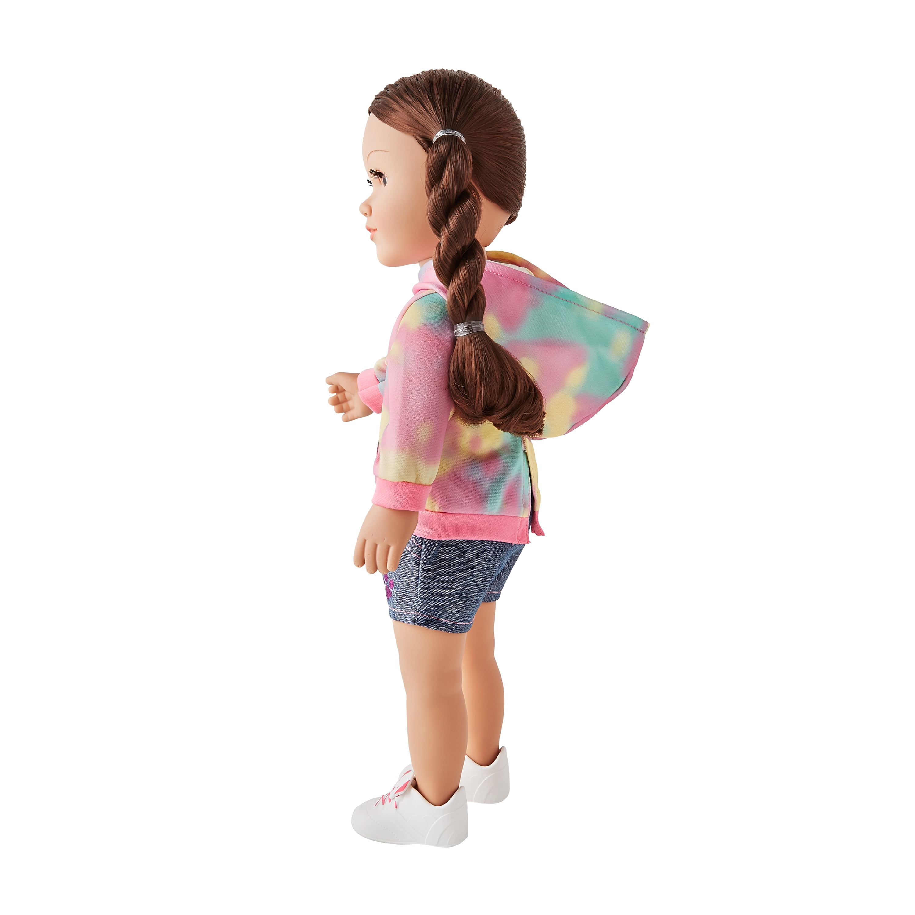 - Dog Trainer Doll is dressed in a colorful tie-dye hoodie, denim-looking shorts, and tennis shoes that feature an adorable dog’s face