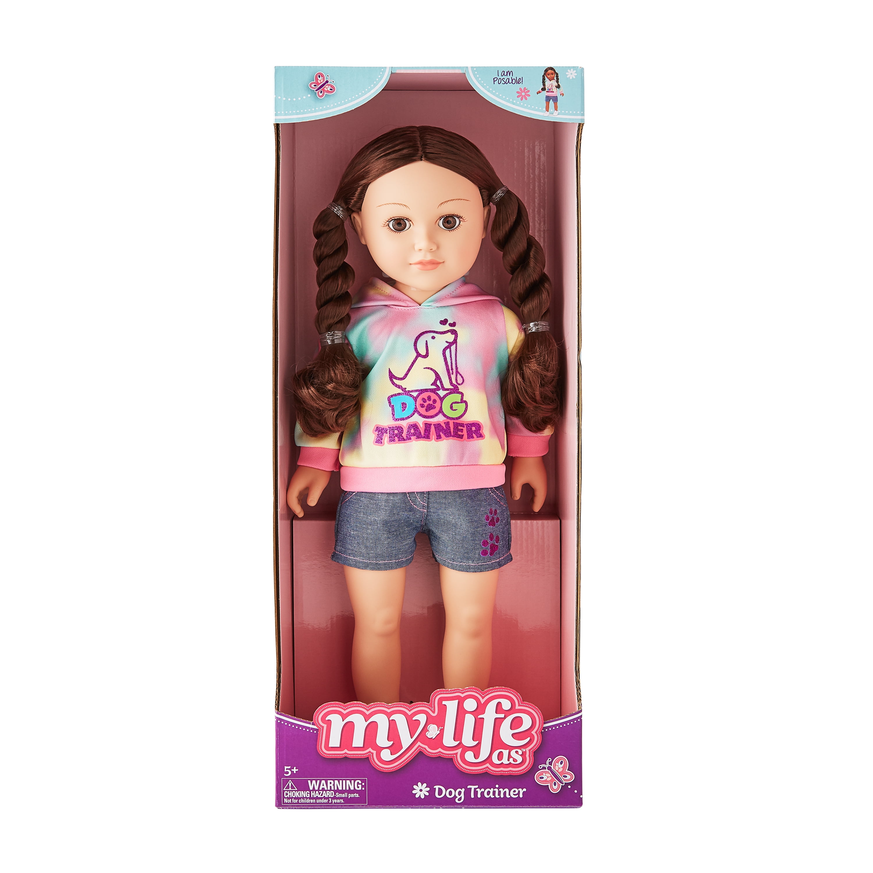 Sit, stay, shake! Watch your little one venture into the world of dog training with the My Life As Dog Trainer 18" Poseable Doll. This poseable doll comes with a colorful tie-dye training hoodie and paw-print screen-printed shorts, and it even comes outfitted with white and pink tennis shoes with an adorable dog face on them! The My Life As Dog Trainer 18" Doll is perfect for the child who loves dogs and aspires to work with them. As part of the full collection of the My Life As dolls, the My Life As Poseable Dog Trainer 18" Doll provides hours of playtime for any child and makes a wonderful Christmas, Hanukkah, holiday, or birthday present. My Life As Dog Trainer 18" Poseable Doll is designed for children ages 5 and up.