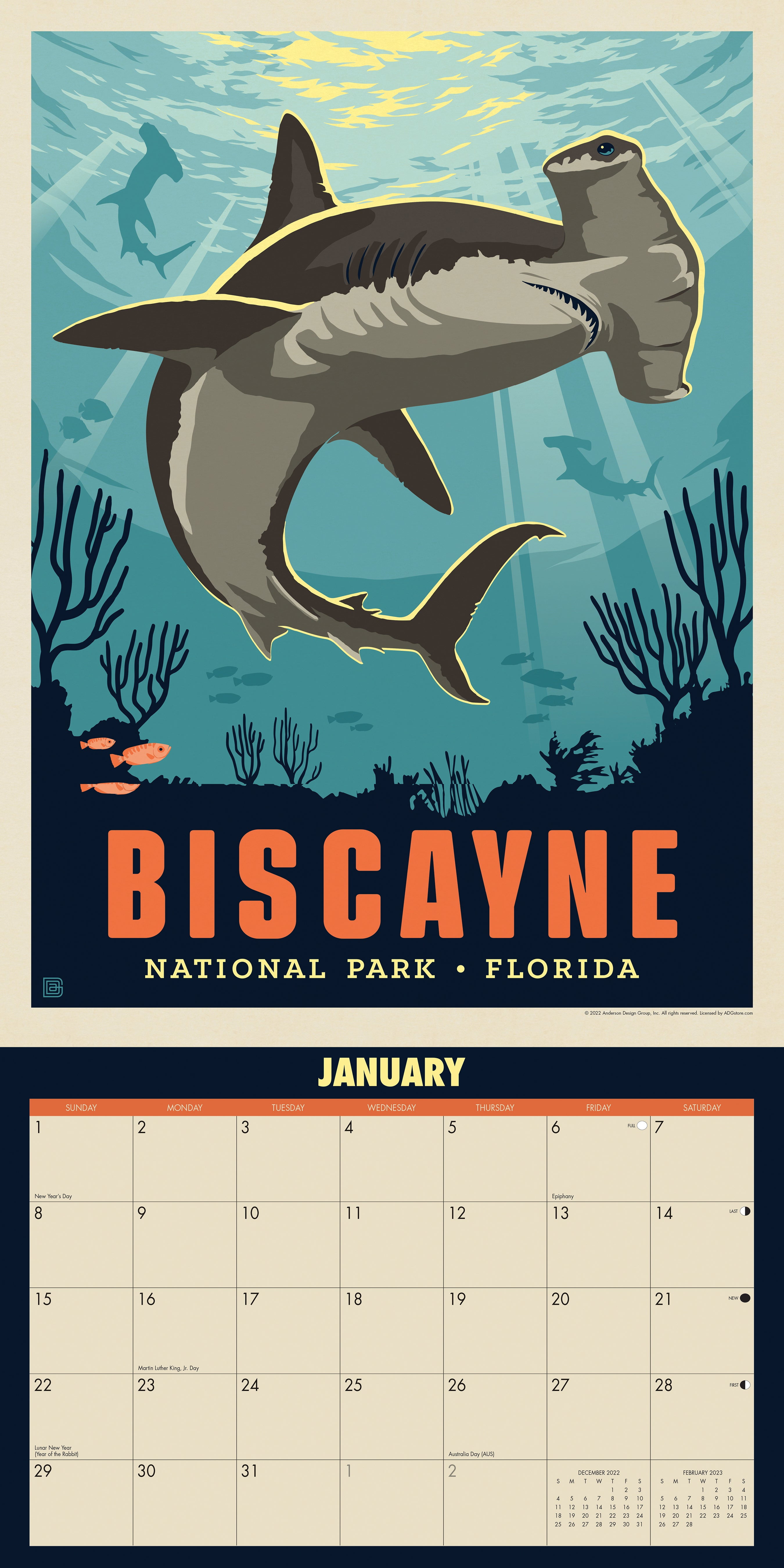 Anderson Design Group’s National Parks calendar celebrates America’s national parks with style. Inspired by vintage poster art from the late 1800s to the mid-1900s, these original posters spotlight great travel destinations and points of interest. Vibrant colors and well-crafted lettering add to the retro vibe of these posters. Printed with soy-based inks on FSC certified paper, this 12" x 12" wall calendar features large monthly grids that offer ample room for jotting notes, along with six bonus months of July through December of 2022. Also includes moon phases (CST), standard U.S. and international holidays.