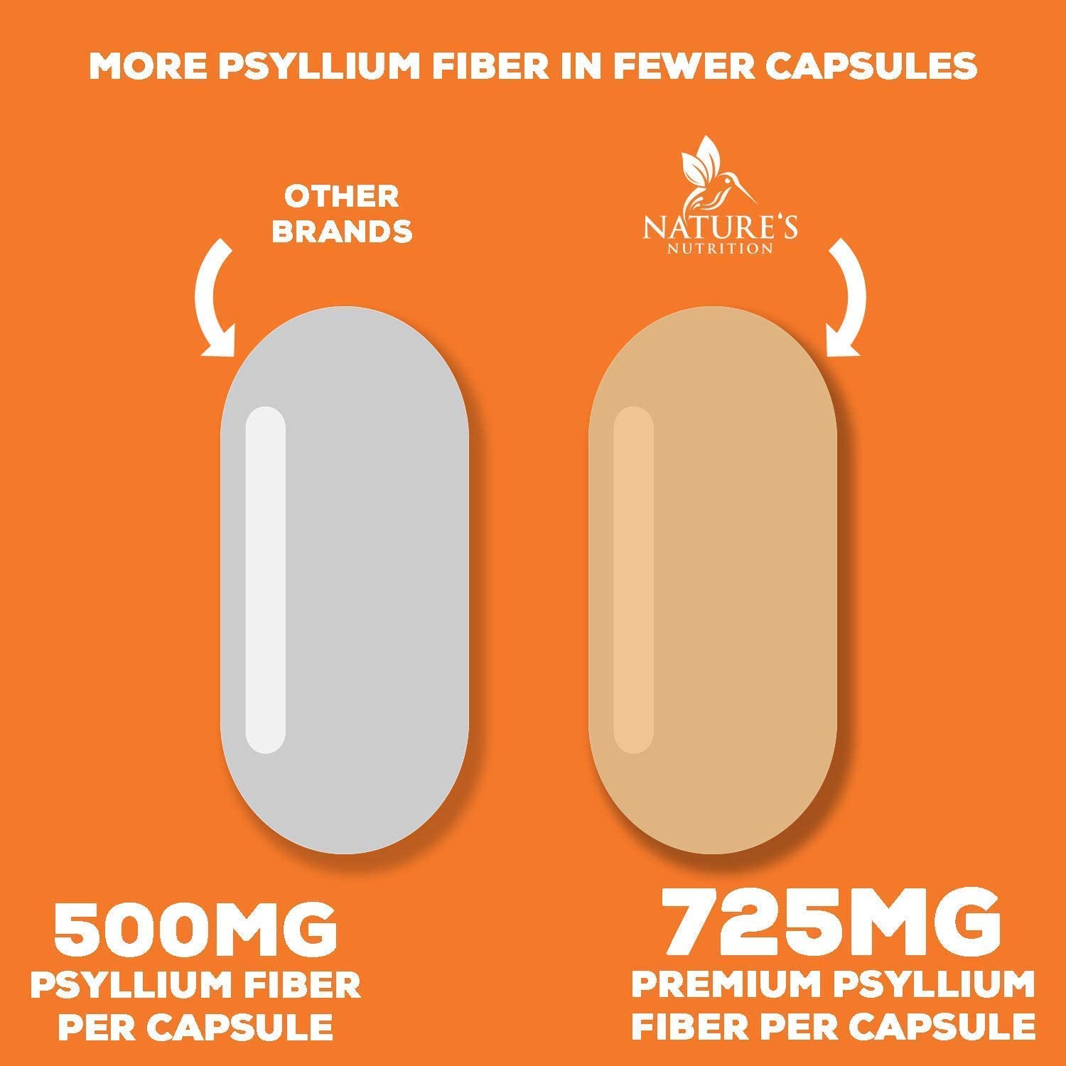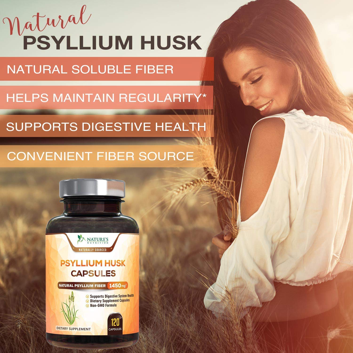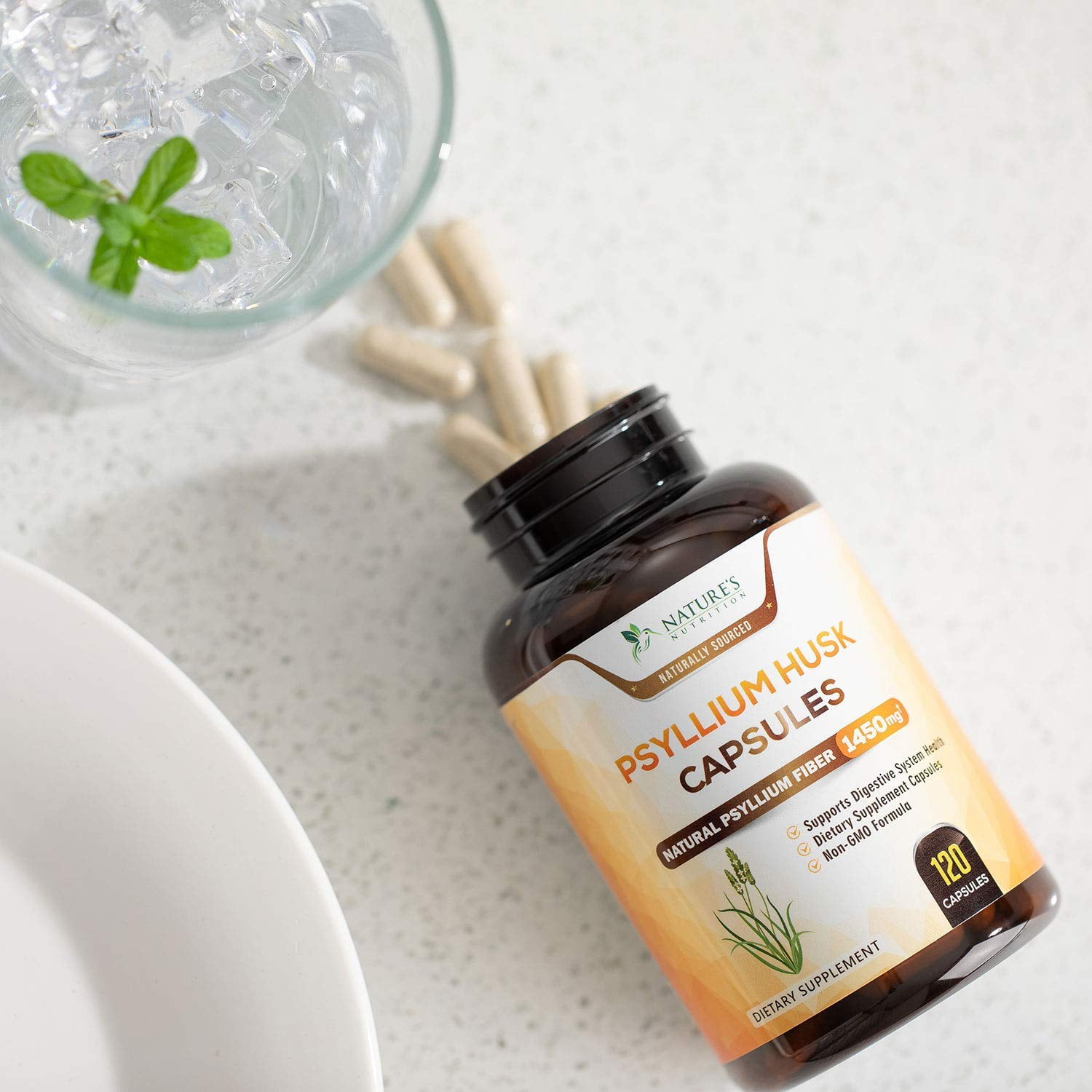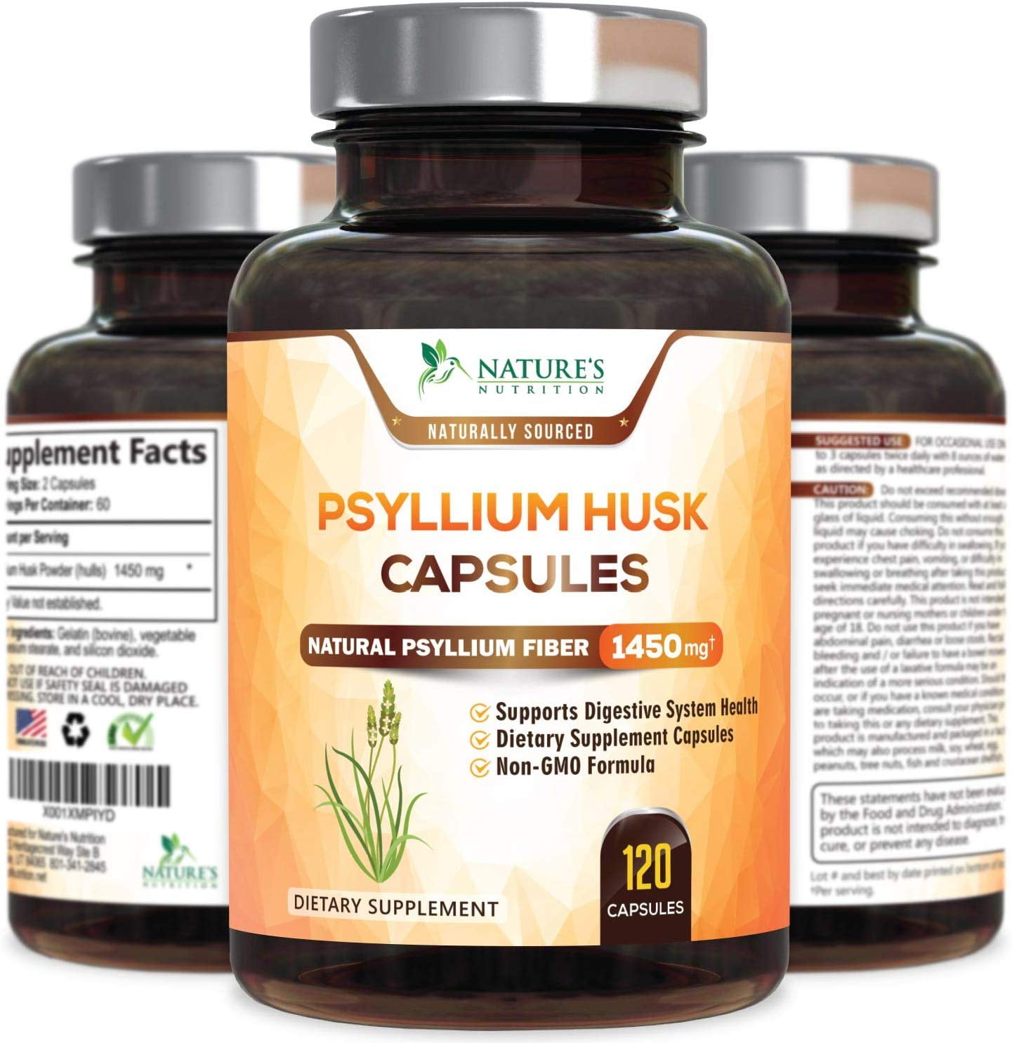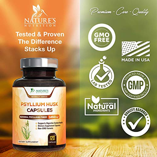 Nature’s Nutrition Psyllium Husk Capsules contain 1450mg of premium quality natural dietary fiber powder to help support digestion and regular bowel movements.