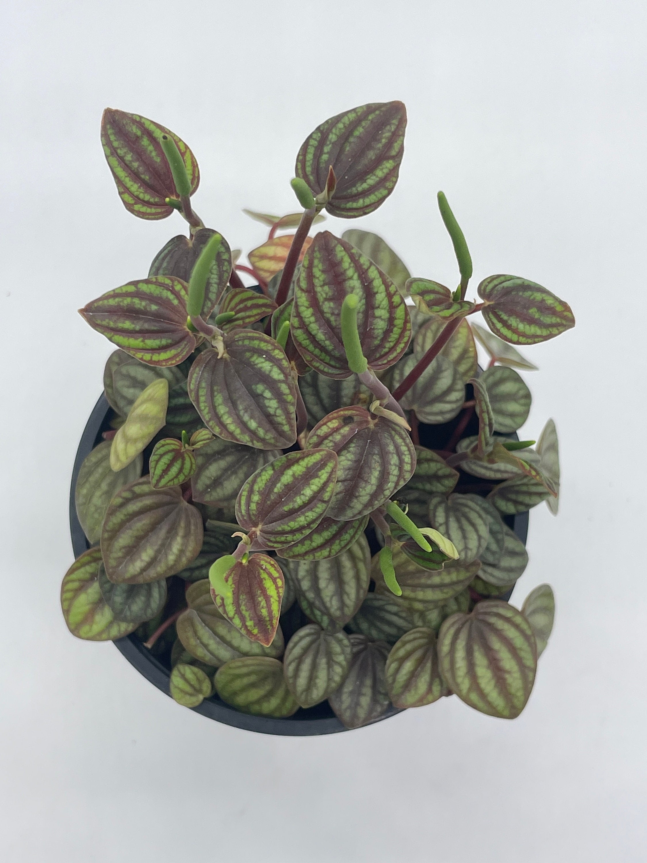 Red and Green Peperomia albovittata,4 inch pot, mixed frost Plant shipped in its 4" inch pot, and ready for a size up! You will receive a plant similar to the ones in the photos.