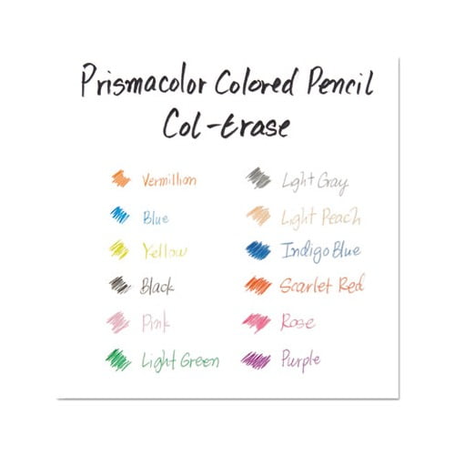 Prismacolor Col-Erase Pencils with Erasers feature vivid, easily-erasable pigments and a strong point that resists breakage. Ideal for print catalog artists and designers, these pencils are well-suited for illustrating, animating, and more. Pencil Type: Drawing; Lead Color(s): Assorted; Barrel Color(s): Assorted; Barrel Material: Wood.