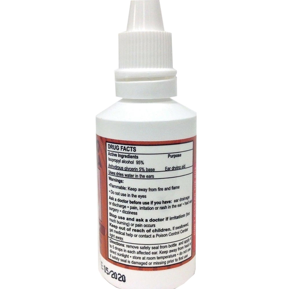 Isopropyl Alcohol based solution for ear aches. Clears water from ear canal. Perfect for swimmer’s ear.